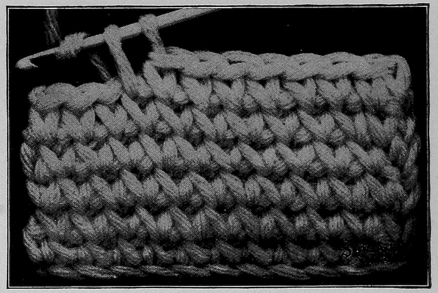 2nd row: Draw out the loop on needle, put yarn over hook and take up 1st loop in the 1 chain below, yarn over and pick up 2nd loop between 1st and 2nd stitch on row below.