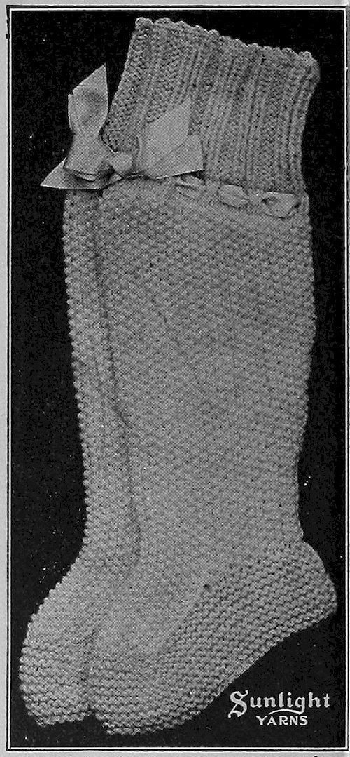 These serviceable bed socks are crocheted with the ribs alternating in pink and white. A pretty border is worked at top and a cord with little pompons on is pulled through to tie with.