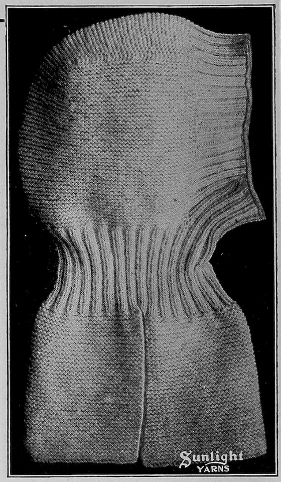 Leave 15 stitches on each side of work on separate needles and knit plain the 18 stitches in middle; turn, and knit plain forward and back for the length of 22 ribs (2 rows make 1 rib). Make 4 more ribs and decrease 3 stitches on each side. Keep the remaining 12 stitches on needle; pick up with the other 2 needles with stitches on, 26 stitches on each side of last knitted part, 1 stitch for each rib. Now you have 106 stitches in all; divide them on 3 needles and knit plain forward and back 2 ribs or 4 rows. Then make 2 rows in lavender, 6 rows in white, 2 in lavender and 5 in white.