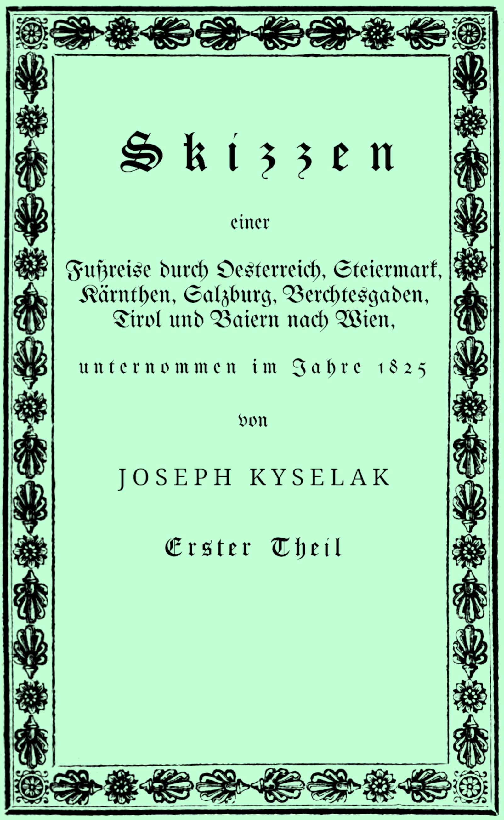 Uebrigens war ich bei Schilderung einer Alpenfußreise nicht gesonnen, mit theilweiser Beschreibung der Provinzialstädte die Naturfreunde einigermassen zu ermüden; da sie ohnedieß mit den ausführlichsten und sichersten Notaten von Grätz, Salzburg, Passau, Linz etc. durch die Schriften der Herren Schultes, Satori etc. hinlänglich bekannt, ihnen daher eine einseitige, in kurzer Zeit geschöpfte Betrachtung, schwerlich verläßlicher, noch weniger aber neu seyn könnte: darum beschrenkte ich mich vielmehr auf die entlegenen VIStationen, Alpen und Merkwürdigkeiten, welche noch nicht hinlänglich erläutert wurden, nebst einigen Gebräuchen, Sitten und Abenteuern, welche Manchen zur schätzbaren Unterhaltung dienen sollen, das Hauptaugenmerk zu richten. Wenn ich zu diesen mir ein Recht zu nehmen wagen konnte, so war es die Ueberzeugung: daß ich seit mehrjähriger Fußwanderung durch das ganze österreichische Erbkaiserthum, in so vielerlei Gegenden gekommen bin, die von einander so verschieden, so einladend oder abschreckend für den Besucher sind. Da ich nun jenen Unterschied auf dieser Exkursion ausschlüssig bemerkte, und dabei nachbenannte Gefilde wiederholt und in den verschiedensten Richtungen durchstrich; so glaube ich, wird man mir so viel Urtheilskraft zutrauen, keine falschen Ansichten oder Uebertreibungen auftischen zu wollen.