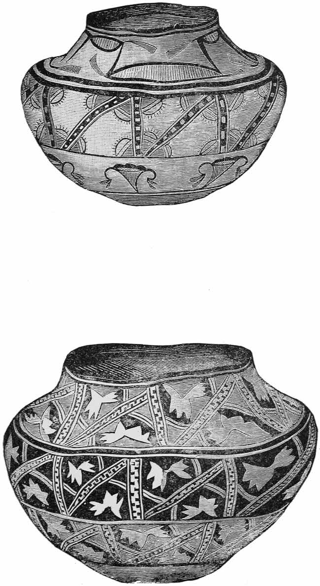 The chiefs told Coronado that their towns were older than the memory of seven generations. They were all built on the same plan, in blocks shaped like a parallelogram, and were from two to four stories high, with terraces receding from the outside. The lower story, without openings, was entered from above by ladders, which were pulled up, and secured them against Indian warfare. There was no interior communication between the stories; the ascent outside was made from one terrace to another. The houses were of sun-dried bricks, and for plaster they used a mixture of ashes, earth, and coal. Every village had from one to seven estufas, built partly underground, walled over the top with flat roofs, and [26]used for political and religious purposes. As in certain other mystic lodges which date back to the days of King Solomon, women were not admitted. All matters of importance were there discussed; there the consecrated fires were kept burning, and were never allowed to go out. The women wore on their shoulders a sort of mantle, which they fastened round the neck, passing it under the right arm, and skirts of cotton. “They also,” writes Castenada, “make garments of skins very well dressed, and trick off the hair behind the ears in the shape of a wheel, which resembles the handle of a cup.” They wore pearls on their heads and necklaces of shells. Everywhere were plenty of glazed pottery and vases of curious form and workmanship, reminding the Spaniards of the jars of Guadarrama in old Spain.