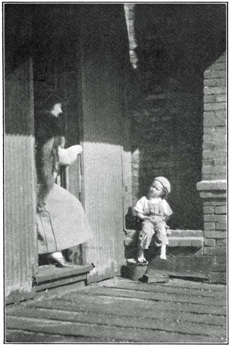 [25]Jakie placed his soiled hand into her dainty gloved hand. She felt the cold of his little hand through her glove. She led him through the crowded street as fast as they could push their way. People stared at a richly dressed, elegant girl, hurrying along the street leading by the hand a ragged, bare-foot child. But Frances’ heart was dancing over the real Christmas fun she was going to have with Jakie. She pulled him in front of her in the partition of a revolving door of a big department store. Jakie was astonished and dumb. He had never seen a revolving door. He stared as if in a bewildered dream at the beautiful store inside. He had never seen anything so beautiful. The victrola was playing Christmas-carols. Gay Christmas bells hung everywhere in the store. Red and green tissue-paper ribbons hung over-head like beautiful tangled spider-webs. It seemed to Jakie that he had suddenly stepped into heaven. He stared about, dazed, as Frances led him through the store to the boy’s clothing department. She stopped by a radiator to get him warm. She stood him close to it, holding his shivering little hands, in hers, to the pipes to warm them. When he stopped shivering she left him standing there to get thoroughly warm. She whispered to the clerk to take him to the dressing room and dress him up in all the things a little boy needs. She picked out a suit of clothes and everything for a little boy’s outfit. She came back to him and taking his hand in hers said as he looked up into her face: