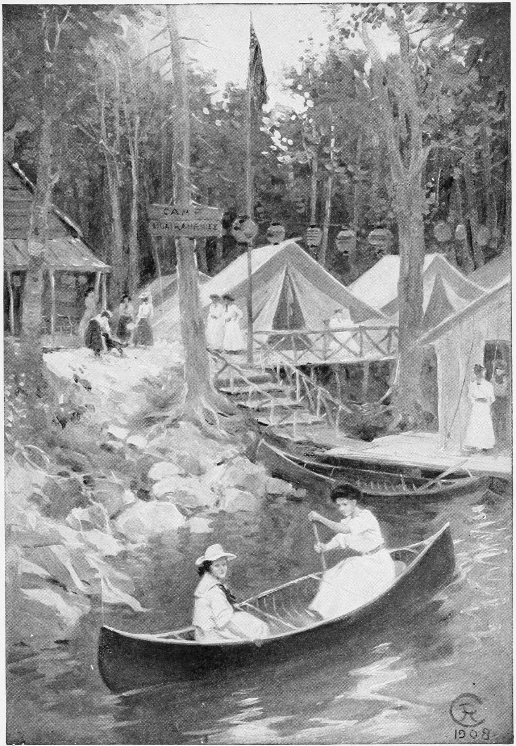Down to the lake tripped the queen and her court. Moored to the dock the royal craft was waiting. A canopy, and plenty of ornamental cheesecloth, had transformed the old camp fishing-boat into a barge which Cleopatra herself need not have scorned. It was draped all in white and crimson; a heap of bright cushions made a throne; a fantastic flag, gay as a Venetian gonfalon, hung over the stern, almost trailing in the water; while to a pole, erected like a mast, wound with crimson and white and flaunting streamers of the same, was secured a large golden shield, with the sword and motto of the order.