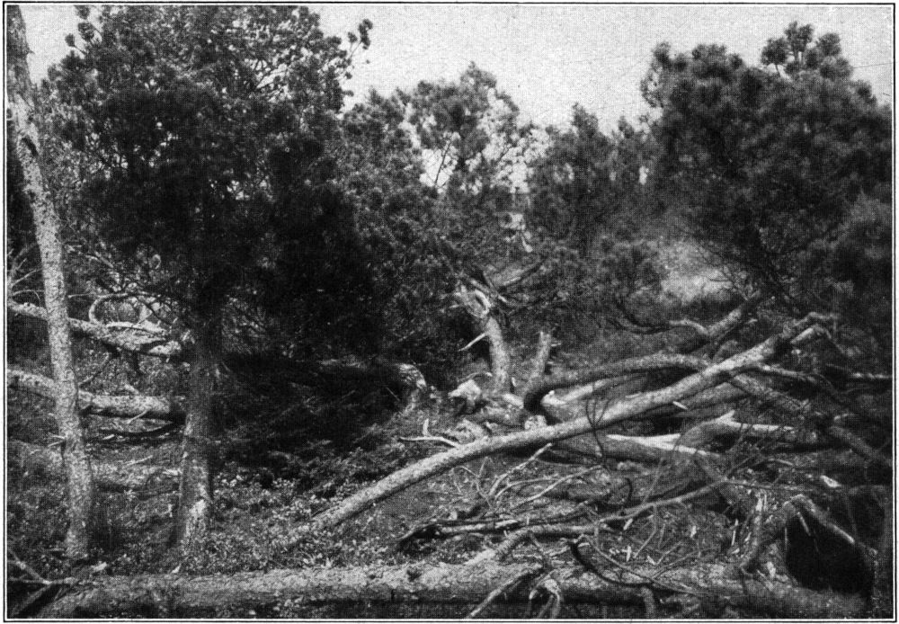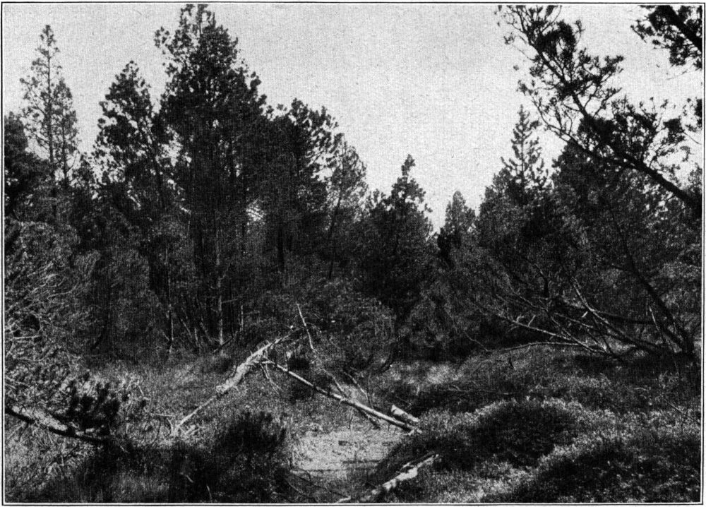 Ein solches Hochmoor gedieh, so lange die jährlichen Niederschlagsmengen reichlich flossen. Ziemlich unvermittelt scheint aber in ganz Mitteleuropa eine Trockenperiode, vielleicht eine Steppenzeit, eingetreten zu sein. Das Wachstum des Moosmoores stockte, und der Moostorf zersetzte sich durch Lufteintritt zu einer dunkelbraunen, strukturarmen Masse. Wie lange diese Trockenheit angehalten hat, ist nicht zu ermitteln. Sicher ist aber, daß auf dem trocken gelegten Moore Heidekraut und Wollgras Platz fanden, die allmählich, wahrscheinlich [55]bei Wiedereintritt reicher Niederschläge, zu einer mulmigen Torfschicht zusammenschwanden. Dieser stark zersetzte Torf wird von Weber Grenzhorizont genannt und findet sich nicht bloß in den norddeutschen und schwedischen Mooren, sondern auch in den Höhenmooren der Mittelgebirge und des Alpenlandes. Bei den Höhenmooren, also auch im sächsischen Erzgebirge, scheint aber anstelle von Heide- und Wollgras ein Trockenwald von Birken aus der Umgebung eingedrungen zu sein, so daß Schreiber, der Erforscher erzgebirgischer Moore, diese Grenzschicht als jüngeren Waldtorf bezeichnet. Auf diese Schicht baut sich, begünstigt durch einsetzende Niederschlagsperiode, ein neues Hochmoor mit fast reinem Sphagnumbestand, aus dem der gelbgefärbte, wenig zersetzte jüngere Moostorf hervorging, dessen Entstehung überall dort noch andauert, wo nicht aus natürlichen Gründen, oder, durch Menschenhand verursacht, Austrocknung die Moosbildung verhindert. An den trockneren Randgehängen unserer Erzgebirgsmoore finden wir als Charakterstrauch die vielästig vom Boden aufstrebende Moorkiefer, eine Unterart uncinata der eigentlichen Bergkiefer Pinus montana (Abb. 18), während in den norddeutschen Zwischenmooren die Krüppelkiefer Pinus silvestris forma turfosa erscheint.