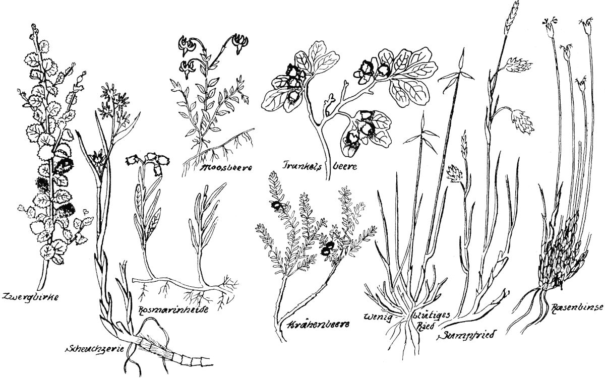 Flachmoore begleiten meist Stromtäler. Zu ihnen darf man rechnen den Spreewald, das Oderbruch, das Lebamoor in Pommern und die ausgedehnten Erlenmoore am kurischen Haff. Sie alle werden teils abgebaut auf Brenntorf oder wurden und werden umgewandelt in Kulturland. Austrocknende Moore werden meist in Besitz genommen von Sträuchern: in Norddeutschland östlich der Elbe von Strauchbirke (Betula humilis), von Gagelstrauch [49]Myrica Gale, von Sumpfporst; oder von Zwergsträuchern: Trunkelsbeere Vaccinium uliginosum, Heidel- und Preißelbeere, auch von Krähenbeere Empetrum nigrum (Abb. 13). Vor allem das Heidekraut (Calluna vulgaris) mit seiner unverwüstlichen Lebenskraft überzieht schließlich jene Moorgebiete besonders bei sandig-grusigem Untergrund, während in bruchigem Gelände, zumal im Nordwesten unseres Vaterlandes, in der Lüneburger Heide, die reizvolle Glockenheide Erica tetralix sich ansiedelt, und der Wacholder (Machandelbaum, Knisterbusch) Juniperus communis seine dunklen Säulenpyramiden baut, um der Landschaft einen lieblich herben Reiz zu verleihen.