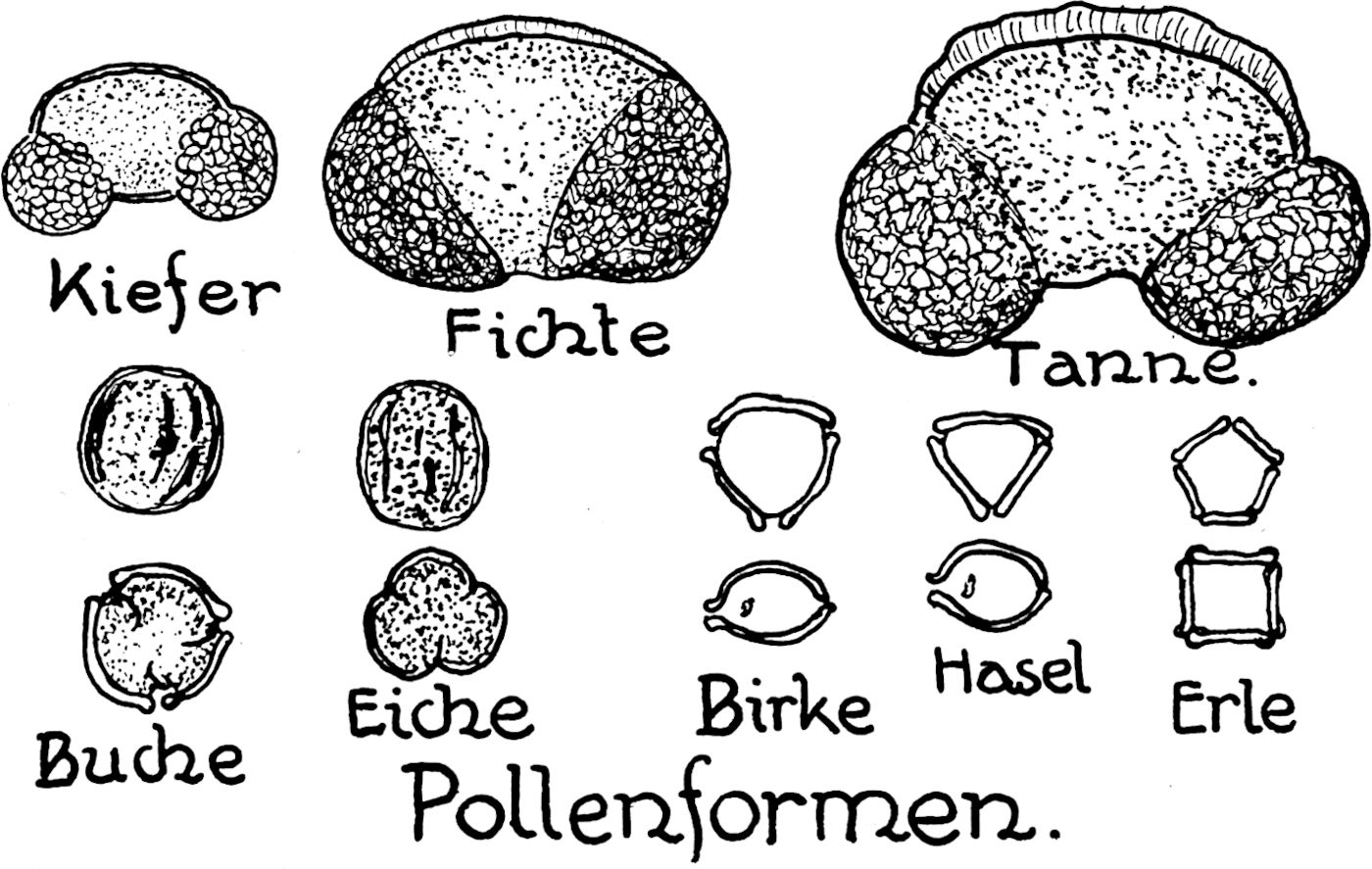 Hierzu befähigt uns eine genaue Kenntnis des Blütenstaubes (Pollen) unserer hauptsächlichsten Waldbäume, sowohl der Nadel- als auch der Laubbäume. (Abb. 19.) Diese Blütenstaubzellen sind äußerst kleine Gebilde. Wir messen sie in Tausendstel eines Millimeters, des sogenannten Mikro, als Maßeinheit und bezeichnen dieses Kleinmaß mit dem griechischen Buchstaben µ. Den Pollen unserer wichtigsten Nadelbäume: Kiefer, Fichte und Tanne kann man von dem Laubbaum-Pollen sofort unterscheiden durch die ihm beiderseits anhängenden [58]zu weiter Verbreitung dienenden Flugblasen, außerdem auch durch die erheblichere Größe. Den kleinsten Pollen unter den Nadelhölzern besitzt die Kiefer mit 60 µ, das Mittelmaß des Fichtenpollens beträgt 100, das der Tannen 140 µ. Die dreieckigen Pollen von Birke und Hasel messen beide etwa 25 µ, und sind schwer zu unterscheiden; von etwa gleicher Größe ist der fünfeckige Pollen der Erle. 30 µ im Durchmesser halten die einander sehr ähnlichen kugeligen Pollenzellen von Buche und Eiche. Den kleinsten Pollen von etwa 15 µ besitzt die Weide.