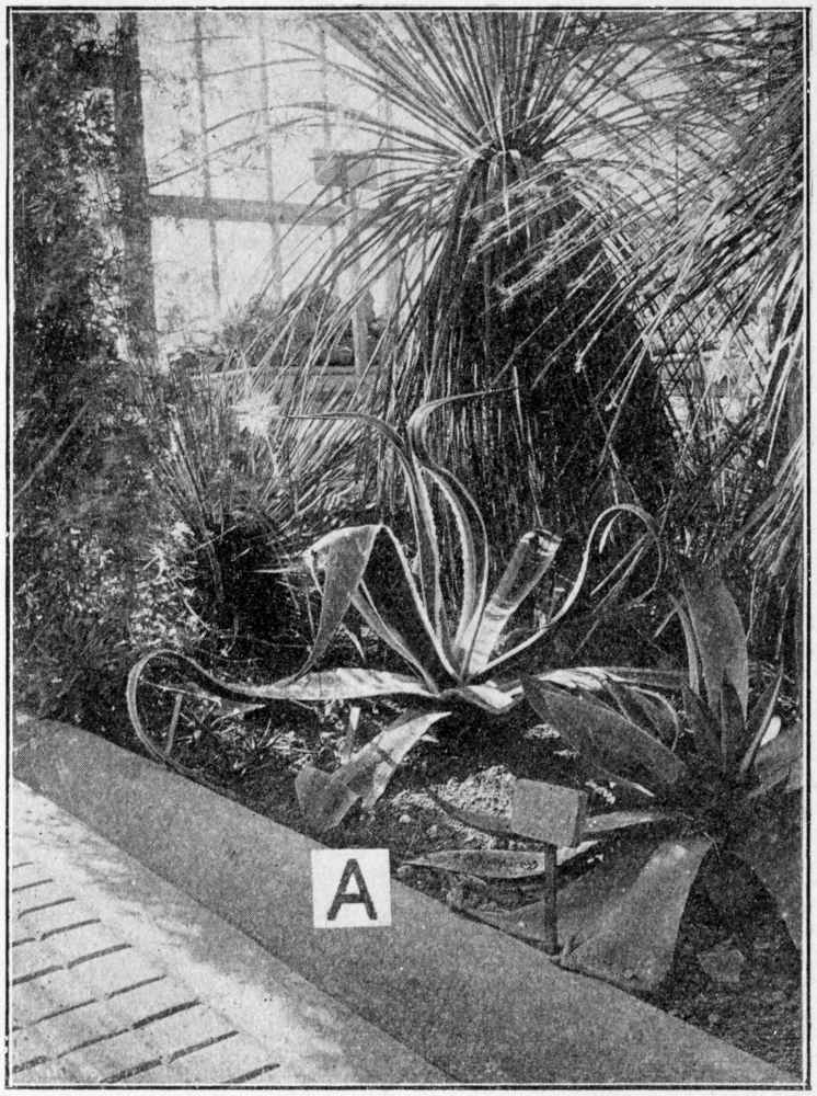 (1) Agave Fourcroydis of Yucatan; this plant yields 990 per cent. of the sisal fibres exported from all countries. The leaves bear marginal spines as illustrated in the Agave Americana shown at A, Fig. 2: the plant was formerly known as Agave Rigida, variety Elongata.