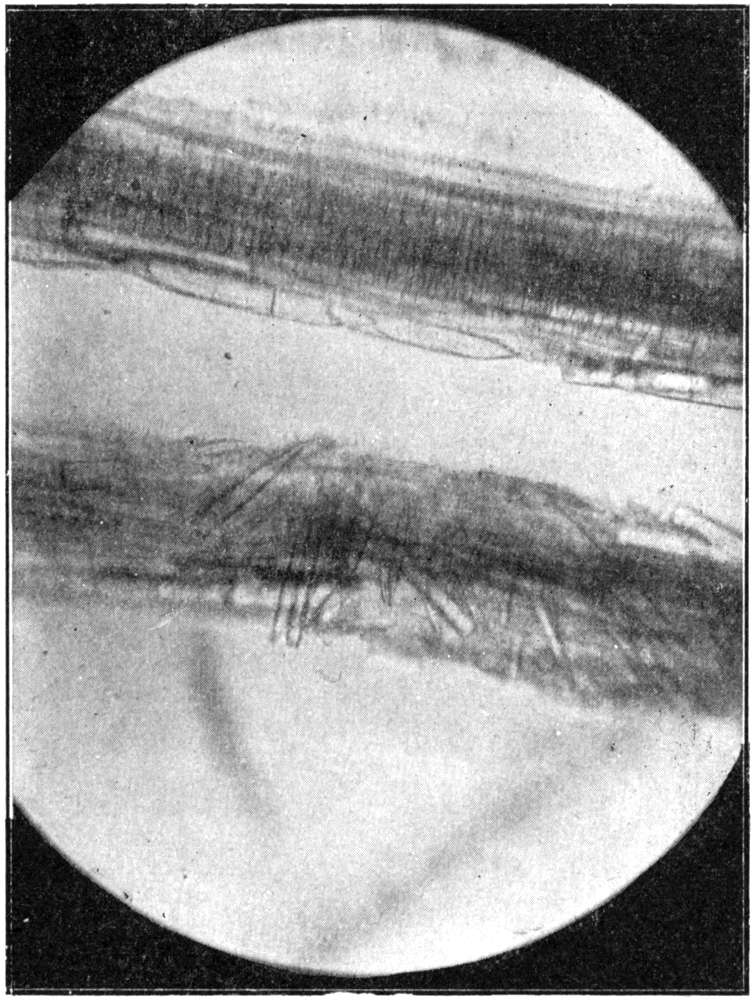12A photomicrograph of two fibres of a type of Agave grown in Mexico is shown in Fig. 5; it is interesting because it depicts the formation of crystals of Oxalate of Potash. The presence of such crystals makes the fibre unsuitable for cordage purposes, but it may be used in the manufacture of coarse brushes.