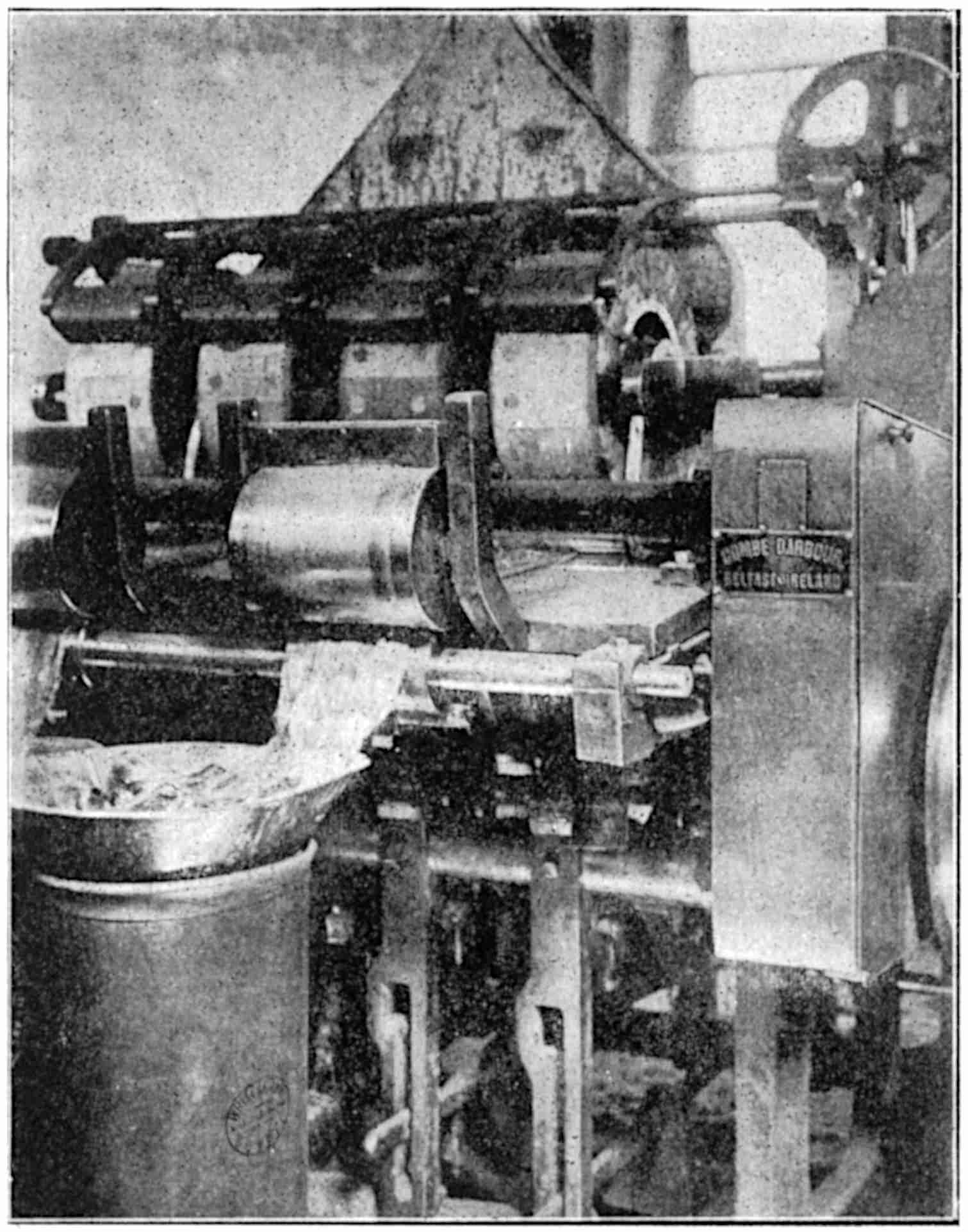 In many cases the twines made by the above process are taken to another machine in which a number of bobbins are again arranged on pins, the twines passed under rollers and immersed in polishing mixtures of starch or size contained in troughs or boxes. A quantity of the size adheres to the twines as they pass through it, and revolving brushes are used to remove the excess 96of size and to clean the twines. These operations are repeated a few times and ultimately the twines so starched, cleaned and polished are led over drying cylinders in front of which are placed rollers covered with suitable material, usually coir yarns. These rollers rotate at a high speed, and sometimes wax is applied to the coir yarn-covered rollers, so that the twines are dried, polished and finished simultaneously before they leave the hot cylinders to be wound on to a second set of empty bobbins. This machine is usually termed a “bobbin to bobbin polishing machine,” and the bobbins upon which the twine is finally wound are frictionally driven because the delivery of twine is constant. In this way the requisite finish or polish is applied to the surface of the twine, and this gives the twine the smart appearance which makes it quite attractive.