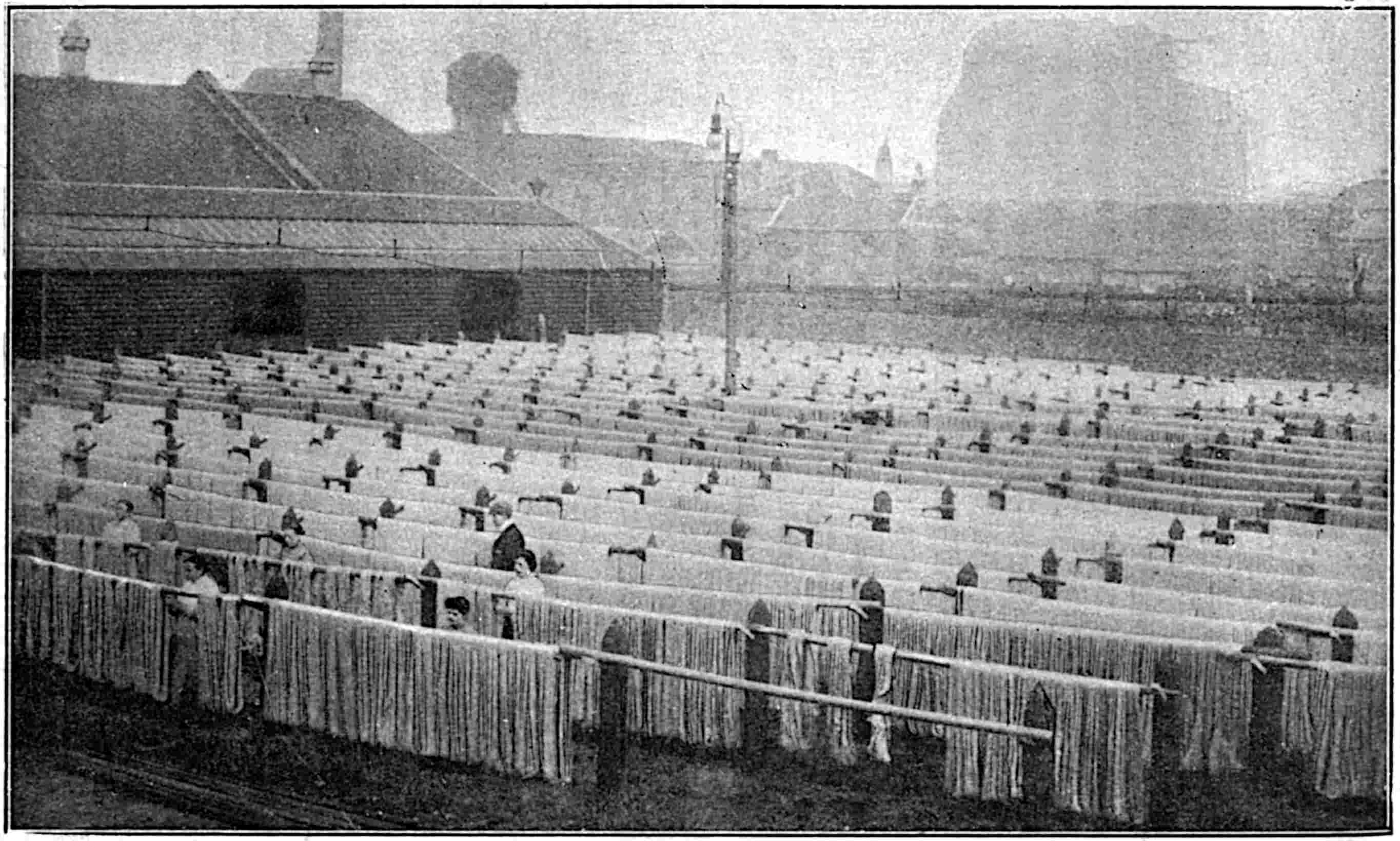 103At the top of the rope-walk is a stand or bank which contains the bobbins of yarn, and this yarn may be dry or tarred according to requirements. The bobbins are arranged on pins and the necessary number of yarns for each strand are drawn from the bobbins and passed, in their proper order for ensuring a uniform strand, through a number of holes in a “register plate” immediately behind the machine. In a modern machine any number of strands up to six can be formed at the same time, and hence there will be six register plates for the yarns. For the larger-sized ropes only one strand can be drawn out in one operation.