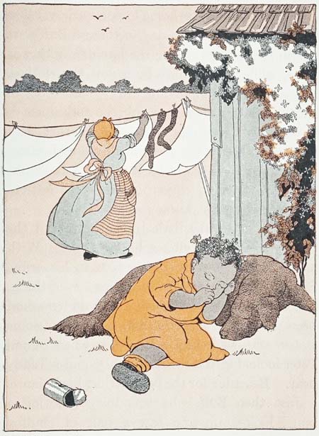 [20]When the laundress was hanging up the clothes to dry, he would help by taking the clothespins in his mouth and handing them to her. Sometimes some hidden trait in his make-up prompted him to take toll of the clothespins when the laundress was not looking. No doubt this was an echo from some of those inferior relations on one or the other side of his ancestral house. Still, it was a natural tendency, as all dogs like to chew clothespins. It sharpens their teeth.
