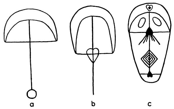 Plate 2. Altar and ash-birds. Upper left, Quapaw permanent cement altar of the John Wilson Big Moon rite. The ash mounds are the “graves” of John Wilson and Jesus Christ; the W’s or M’s on each side of the heart signify “Moon-Head” or “Wilson.” The nearest heart of the mound is the Heart of the World, that under the fire the Sacred Heart of Christ, that on the moon the Heart of Goodness on which the father peyote rests. Seven lines around the apron represent week days, the twelve lines the months of the year. The ashes mean the parting of the Red Sea, or mean to some the sheep and the goats. This altar was made by the authorised builder, Victor Griffin, and his assistant, Charley Tyner. Upper right, Symbolic peyote painting by Mopope (Kiowa) showing sacred staff, seven-marbled drum, drumstick, gourd rattle, doctoring feathers, and altar or moon with ash crescent. The water bird intermediary is carrying a prayer from the father peyote on the altar across the ritual fire to the great spirit indicated by the seven rays of feathers of the rising sun. The lightning lines from the god-head result from the artist’s visits to the Southwestern pueblos. Center, A fine example of the scissors-tail ash bird made at an Oto meeting near Red Rock, Oklahoma. Lower, An unusually fine example of the water bird ash bird made at a Shawnee meeting near McCloud. The burnt sticks finish out the scissors-tail of the bird. The smokestick in the foreground is carved with native and Christian symbols (now in Peabody Museum, Harvard University). (It is believed that the Yuchi altar of Petrullo, Plate 2, is erroneously figured and is of the order of those shown here.)