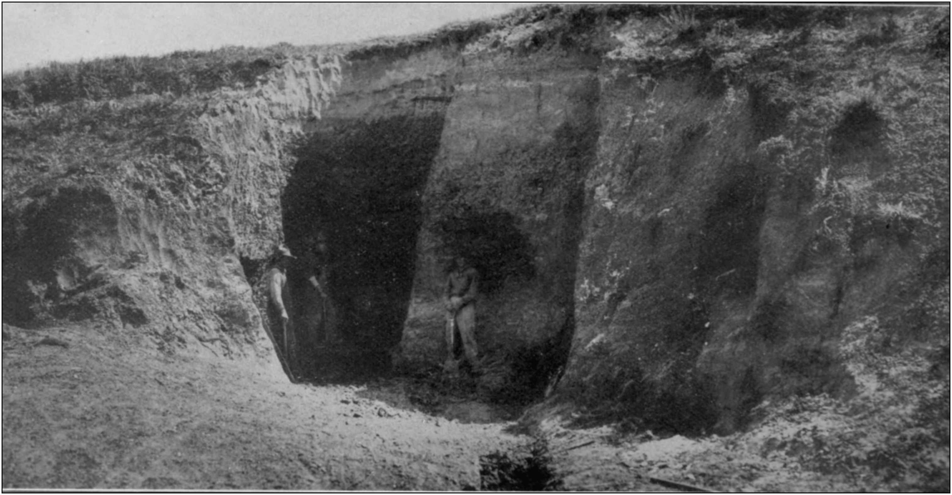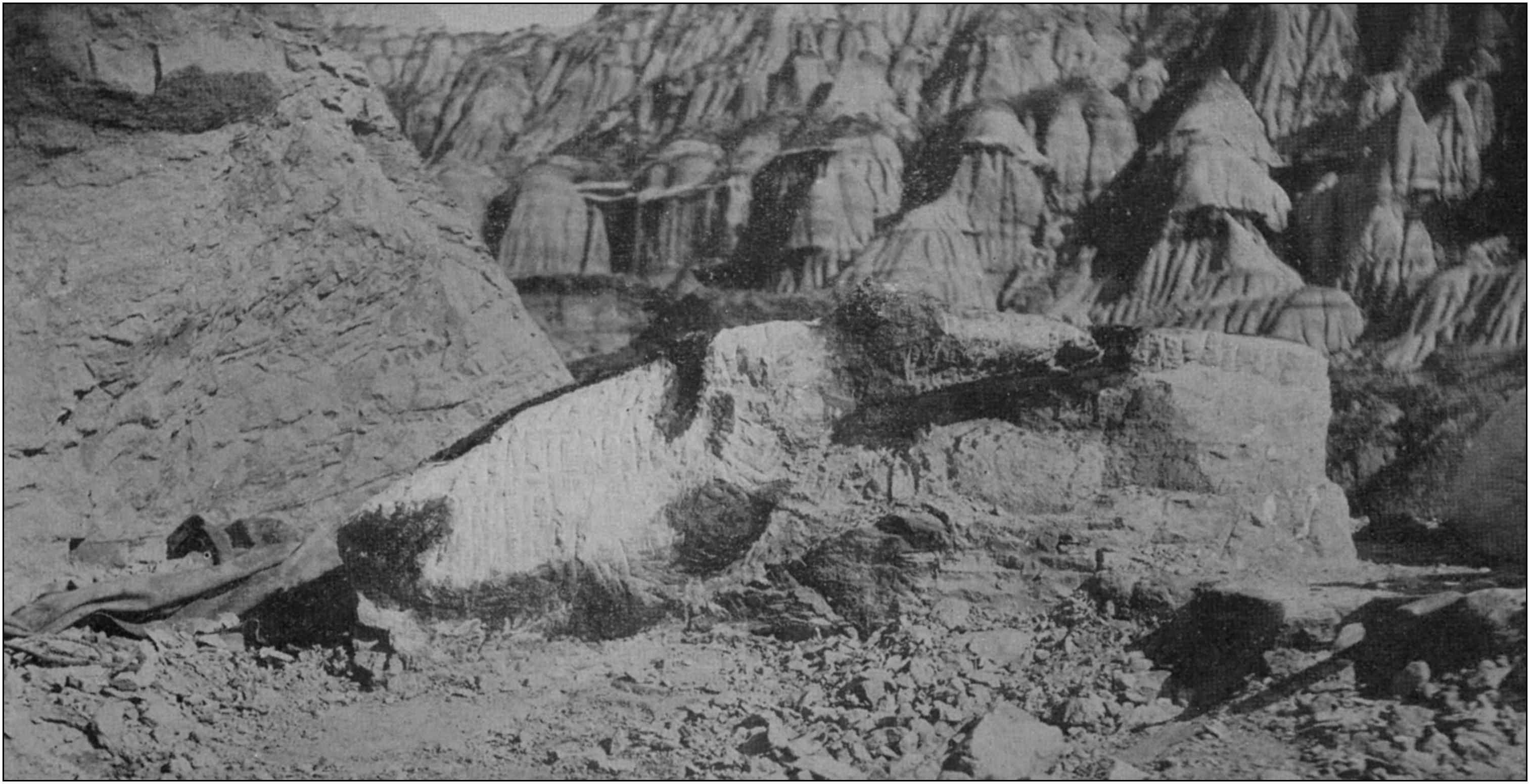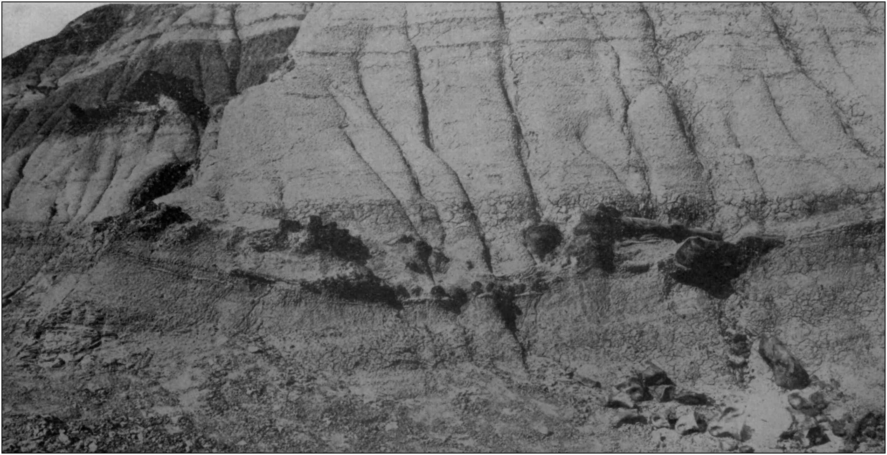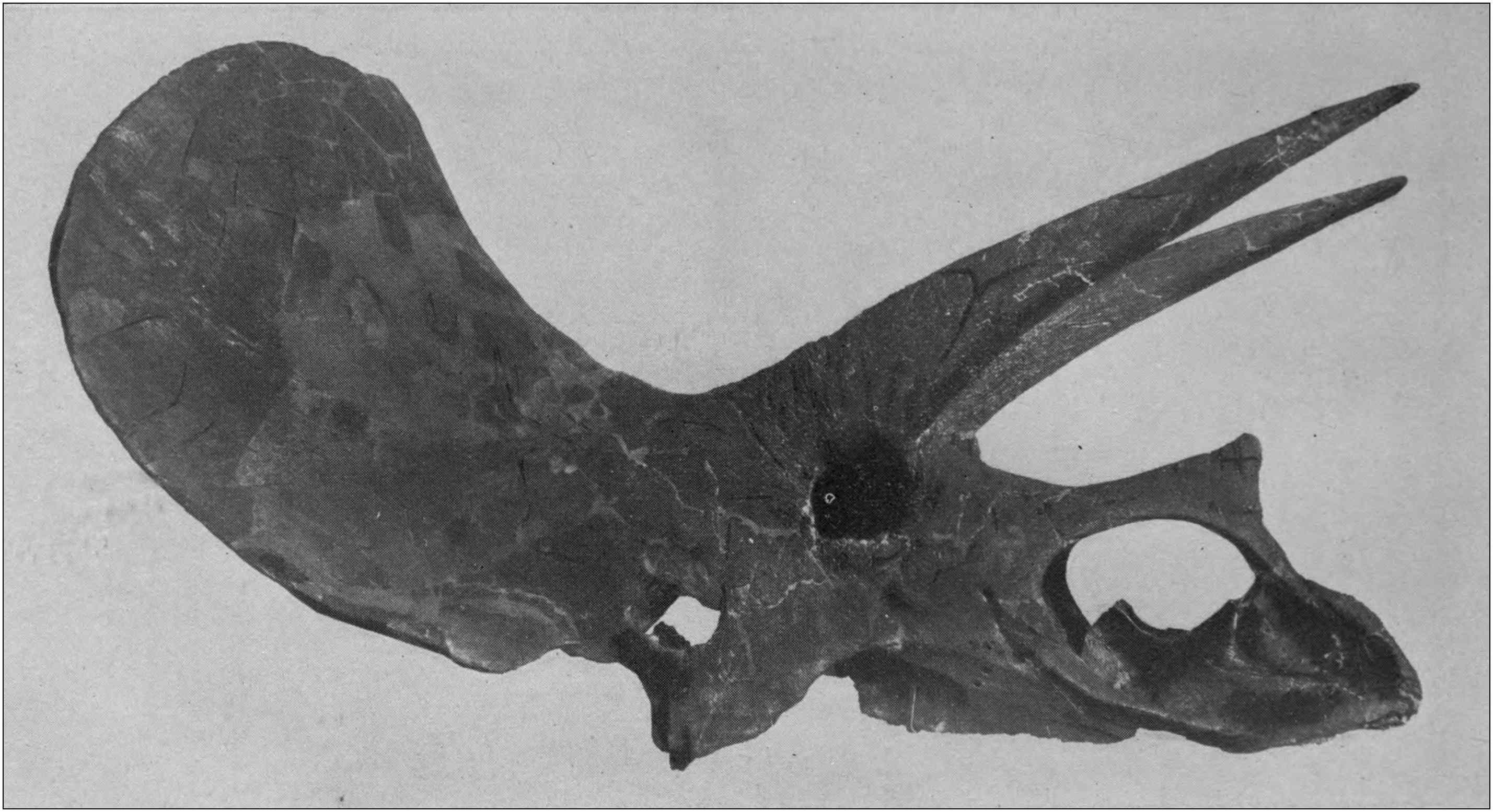 In 1909 Charles M. Sternberg discovered the magnificent skull of a Triceratops, also sold to the American Museum, and mounted there. This is the best skull of this species known, with the notable exception of the Utterback specimen at Carnegie Museum, Pittsburgh. Charlie’s specimen was found on Seven Mile creek, two and a half miles northeast of the McKeon Sheep Ranch. The skull was over five feet long. The horns 33½ inches in length. The crest itself on weathering out was badly shattered, the fragments having fallen from a perpendicular cliff into a sandy ravine and becoming buried in the sand. Though we spent much time in sifting the sand through our fingers, Dr. Osborn sent us back the next year, when George and Levi Sternberg sifted tons of sand and secured enough additional fragments to enable the preparators at the American Museum to mount the skull in fine condition as is shown in photograph reproduced here. (Fig. 3.)