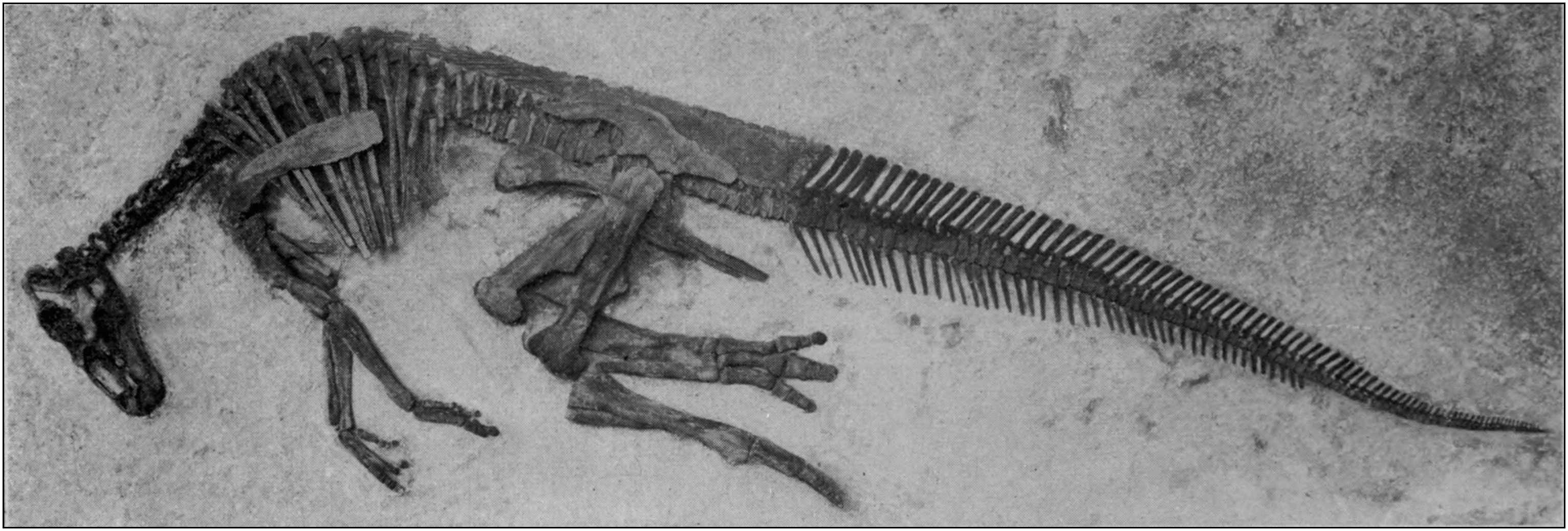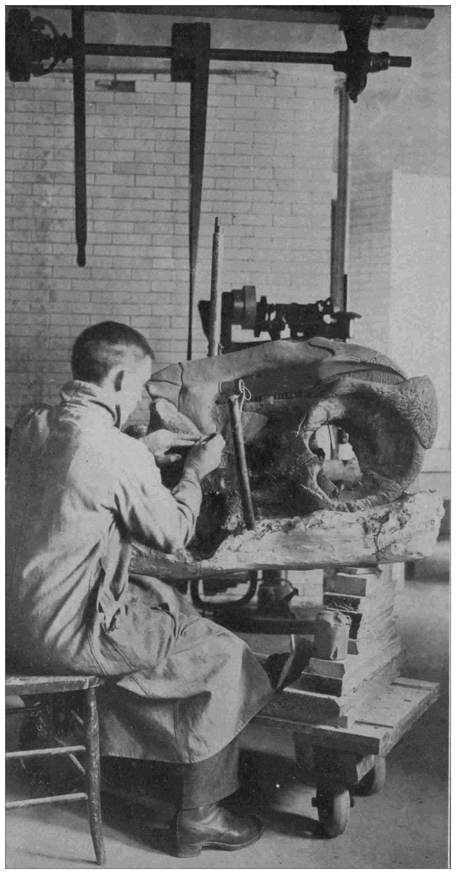 Now after eight years in the cemeteries of the duck-billed dinosaurs, with the discovery by my party of several new genera, as well as a careful study of their environment: as recorded in the rocks in which they lie buried, and eight months each year in the laboratory cleaning, mending, preparing and mounting them—my vision has broadened; I have indeed been forced by incontestible evidence to give up my old ideas in regard to their habits and surroundings. In fact Paleontology, like all human science—or rather scientific theories, for the actual facts of science never change—progresses. Evidence to prove certain views seemed conclusive to the old paleontologist; but better collections, trained students and further knowledge prove these views inadequate today. Entirely different views are held now, as in the case of the duck-bills, for instance. These lived in the water instead of on land, and consequently they had thin skin and strong paddles, or rather webbed feet.