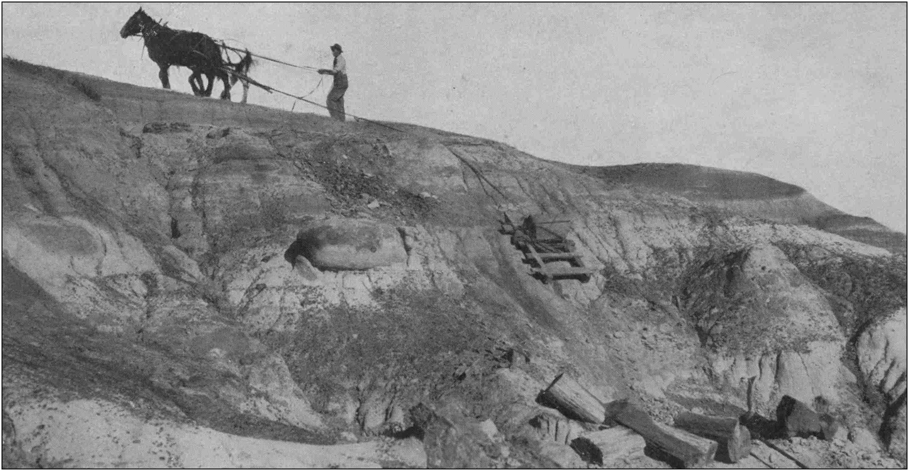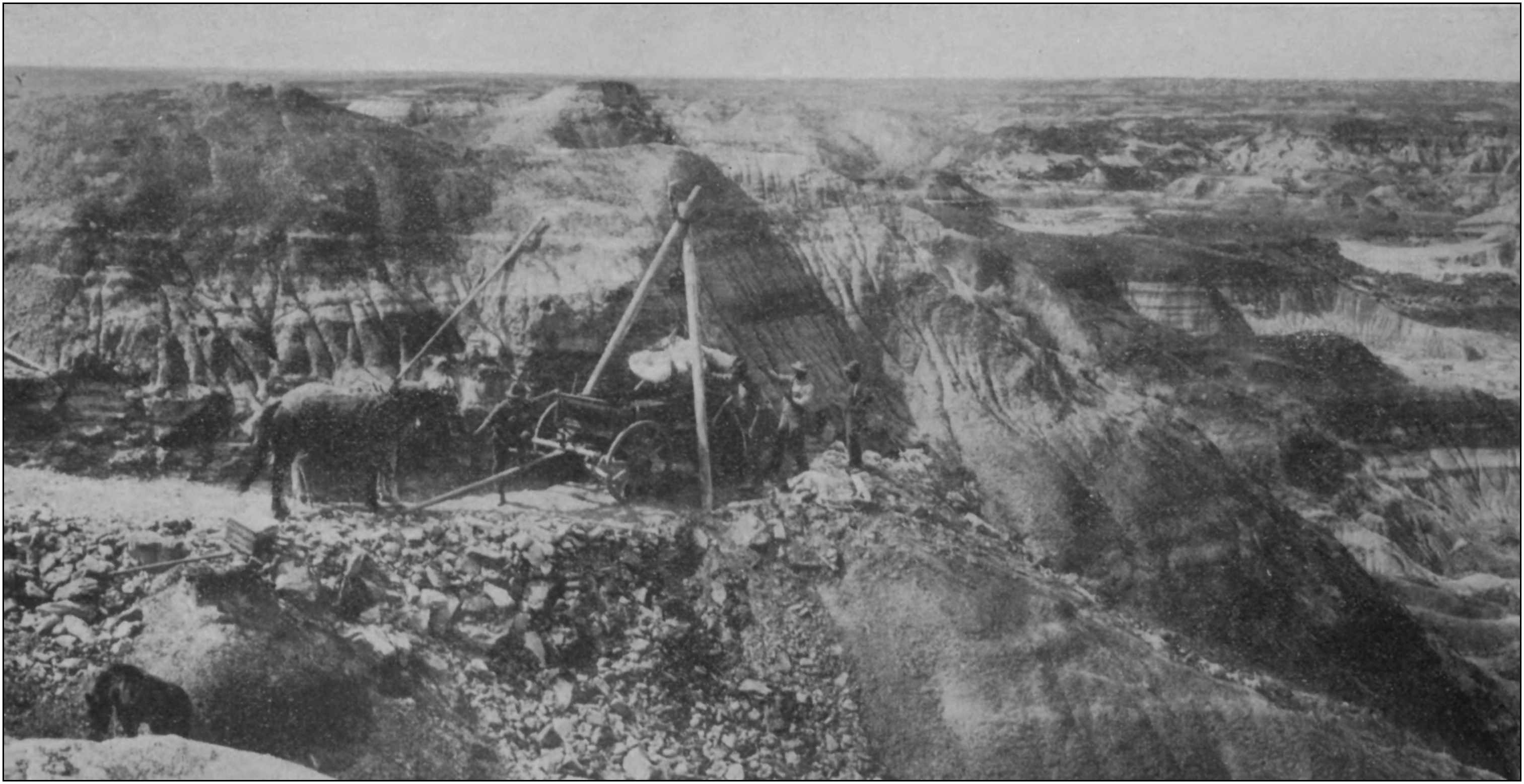 Two seasons my sons and I collected in the Kansas Chalk, the Lance Beds of the old Converse County that is now named Niobrara County, Wyoming, and in the Oligocene, of the same County. Strange to say, however, five years have been spent in the Dominion of Canada, where, with the assistance of my three sons, I helped[2] build up a great collection of the Dinosaurs of the Red Deer River, Alberta, under the direction of the Geological Survey of Canada. The present year of 1916, with the help of my youngest son Levi, I have been engaged in the same service for the British Museum of Natural History. As my readers will bear witness, in the past, I have seen my choicest treasures for forty years leave my hands forever, to add to the glories of museums I shall in all probability never see. When the opportunity came, however, so suddenly and unexpectedly—the opportunity of a life time—to crown my last days with a monument that only time’s ravages or the vandal hand of man can efface, in that growing Dominion of the North that promises to be one of the great countries in the boundless Western Hemisphere, it seemed to me like a call from heaven. Though the ties of a lifetime, nearly, that bound me to many a dear friend at Lawrence, Kansas, must be severed. Though I must leave the protecting folds of my father’s flag and mine, and I must live under a flag that has waved a thousand years—under a Monarch, in fact—I, a republican of republicans! Think of it! After three years residence in the beautiful city of Ottawa, the capital of all the broad expanse North of the international line, after four seasons of work among buried dinosaurs and three winters spent in the laboratory of the Victoria Memorial Museum of Ottawa, I am free to confess I would not have known so far[3] as personal liberty is concerned that I was all this time in the employ of his Royal Majesty George the Fifth of England and ruler of the British Empire. I have learned, I believe, that a man is as much a man amidst the snows of the Lady of the North, under the Union Jack, as under my own beloved Stars and Stripes. Our hopes, our ideals, our aims are much the same.