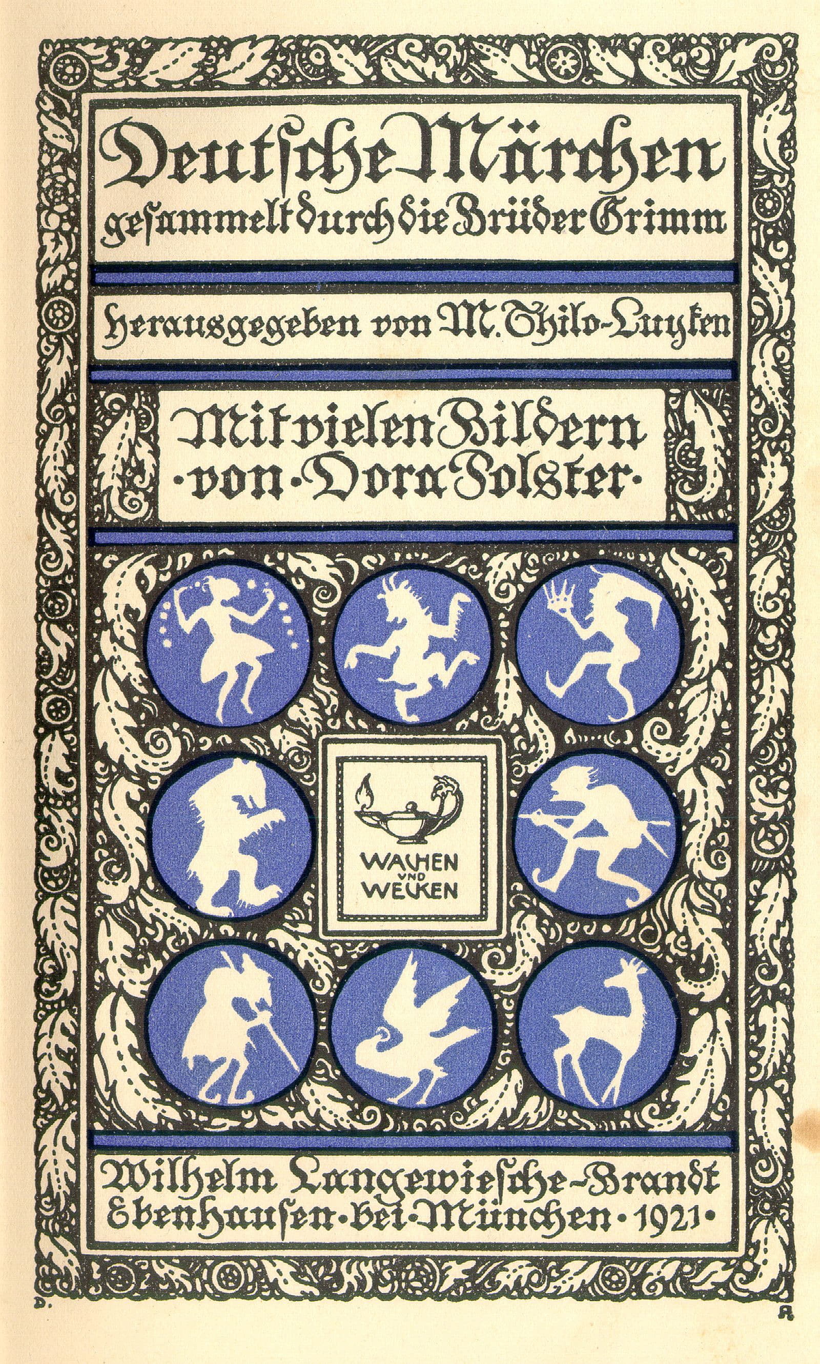 Es war einmal ein alter König, der war krank und dachte: »Es wird wohl das Totenbett sein, auf dem ich liege.« Da sprach er: »Laßt mir den getreuen Johannes kommen.« Der getreue Johannes war sein liebster Diener, und hieß so, weil er ihm sein lebelang so treu gewesen war. Als er nun vor das Bett kam, sprach der König zu ihm: »Getreuester Johannes, ich fühle, daß mein Ende herannaht, und da habe ich keine andere Sorge als um meinen Sohn: er ist noch in jungen Jahren, wo er sich nicht immer zu raten weiß, und wenn du mir nicht versprichst, ihn zu unterrichten in allem, was er wissen muß, und sein Pflegevater zu sein, so kann ich meine Augen nicht in Ruhe schließen.« — Da antwortete der getreue Johannes: »Ich will ihn nicht verlassen und will ihm mit Treue dienen, wenn's auch mein Leben kostet.« — Da sagte der alte König: »So sterb' ich getrost und in Frieden.« Und sprach dann[S. 14] weiter: »Nach meinem Tode sollst du ihm das ganze Schloß zeigen, alle Kammern, Säle und Gewölbe, und alle Schätze, die darin liegen: aber die letzte Kammer in dem langen Gange sollst du ihm nicht zeigen, worin das Bild der Königstochter vom goldenen Dache verborgen steht. Wenn er das Bild erblickt, wird er eine heftige Liebe zu ihr empfinden und wird in Ohnmacht niederfallen und wird ihretwegen in große Gefahren geraten; davor sollst du ihn hüten.« Und als der treue Johannes nochmals dem alten König die Hand darauf gegeben hatte, ward dieser still, legte sein Haupt auf das Kissen und starb.