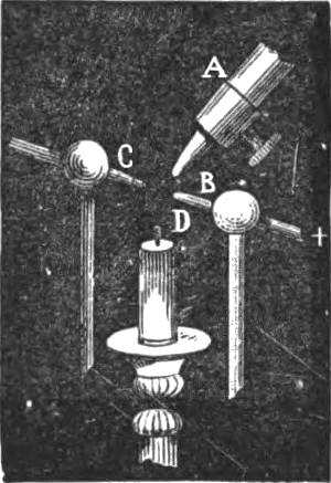 This stud is placed behind the scenes, ready to the hand of an assistant, who plays the part of the invisible medium. Artfully concealed wires and metallic connections communicate [Pg 251]with the inside of the drum, whether placed on the tripod, or hanging by the cords.