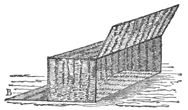 Another object, which is now frequently produced from the portfolio, is a square fernery with glass sides, standing about 15 inches high, and of the appearance depicted in Fig. 35. The framework of the fernery is made of tin. The feet—which are not solid at the angles, as they at first sight appear to be, but each consist of two separate pieces of tin—may be folded flat against the bottom, and the top and sides in like manner fold, down one by one, the whole occupying ultimately a space of little more than an inch deep. Of the ferns, the greater number are glued flat against the glass sides, while a few in the centre are attached to a spring flap, folding down with the sides, but rising as soon as these are lifted.—Ed.