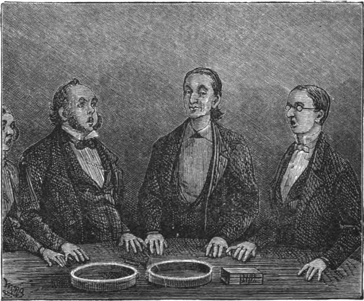 Lest the simplicity of the explanations we have here given should tend to discredit their genuineness, we may remind the reader that the art of conjuring consists not half so much in doing wonderful things (for what is actually done is often very simple), as in persuading the spectator that wonderful things are done. It is a matter of common knowledge among conjurors, that not one spectator in a hundred, unless he be himself a conjuror, can give even a fairly correct account of what has been visibly done in the performance of a trick. And if such be the case in broad gaslight and with every opportunity of observation, how much more is it likely to be so in darkness or semi-darkness, with scarce half of the physical senses permitted to be used, and the mental vision obscured by the belief or semi-belief of supernatural intervention.—Ed.]