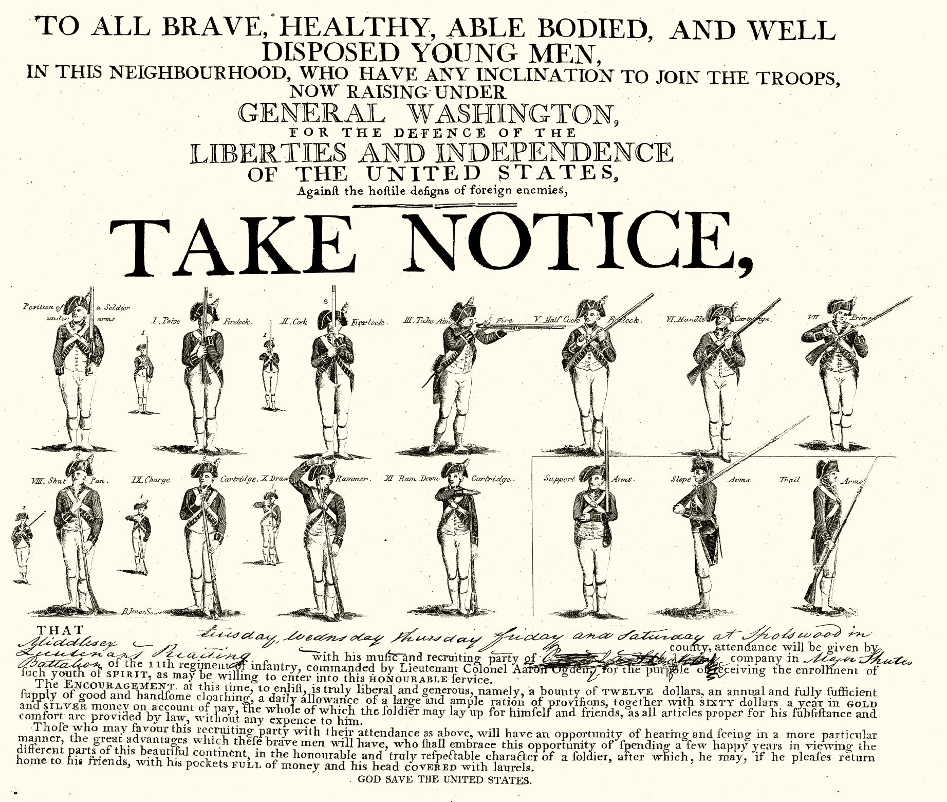 Oct the 19th, second day.—Now for new and uncommon scenes! As I was laying in bed and ruminating on past and present events, and thinking how happy I should be if I could see you, Liddy came running into the room, and said there was the greatest drumming, fifing, and rattling of waggons that ever she had heard. What to make of this we were at a loss. We dress'd, and down stairs in a hurry. Our wonder ceased: the British had left Germantown, and our army were marching to take possession. It was the general opinion they would evacuate the capital. Sister B. and myself and G. E. went about half a mile from home, where we could see the army pass. Thee will stare at my going, but no impropriety in my opine, or I should not have gone. We made no great stay, but return'd with excellent appetites for our breakfast. Several officers call'd to get some refreshments, but none of consequence till the afternoon. Cousin P. and myself were sitting at the door; I in a green skirt, dark short-gown, &c. Two genteel men of the military order rode up to the door: "Your servant, ladies," &c.; ask'd if they could have quarters for General Smallwood. Aunt F. thought she could accommodate them as well as most of her neighbors; said they could. One of the officers dismounted, and wrote "SMALLWOOD'S QUARTERS" over the door, which secured us from straggling soldiers. After this he mounted his steed and rode away. When we were alone, our dress and lips were put in order for conquest, and the hopes of adventures gave brightness to each before passive countenance. Thee must be told of a Dr. Gould, who, by accident, had made acquaintance with my father,—a sensible, conversible man, a Carolinian,—and had come to bid us adieu. Daddy had prevailed on him to stay a day or two with us. In the evening his Generalship came, with six attendants, which compos'd his family; a large guard of soldiers, a number of horses and baggage-waggons, the yard and house in confusion, and glitter'd with military equipments. Gould was intimate with Smallwood, and had gone into Jesse's to see him: while he was there, there was great running up and down stairs, so I had an opportunity of seeing and being seen: the former the most agreeable, to be sure. One person, in particular, attracted my notice: he appear'd cross and reserv'd; but thee shall see how agreeably disappointed I was. Dr. Gould usher'd the gentlemen into our parlour, and introduc'd them—"Gen. Smallwood, Capt. Furnival, Major Stodard, Mr. Prig, Capt. Finley, and Mr. Clagan, Col. Wood, and Col. Line." These last two did not come with the Gen'l; they are Virginians, and both indispos'd. The Gen'l and suite are Marylanders. Be assur'd I did not stay long with so many men, but secur'd a good retreat, heart-safe so far. Some sup'd with us, others at Jesse's; they retir'd about in in good order. How new is our situation! I feel in good spirits, though surrounded by an army, the house full of officers, the yard alive with soldiers,—very peaceable sort of people, tho'; they eat like other folks, talk like them, and behave themselves with elegance; so I will not be afraid of them, that I won't! Adieu. I am going to my chamber, to dream, I suppose, of bayonets and swords, sashes, guns, and epaulets.