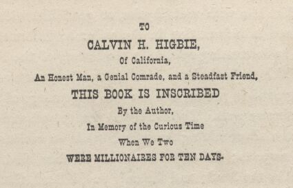 Note: Some of the phrases in the above are mining technicalities, purely, and may be a little obscure to the general reader. In "placer diggings" the gold is scattered all through the surface dirt; in "pocket" diggings it is concentrated in one little spot; in "quartz" the gold is in a solid, continuous vein of rock, enclosed between distinct walls of some other kind of stone—and this is the most laborious and expensive of all the different kinds of mining. "Prospecting" is hunting for a "placer"; "indications" are signs of its presence; "panning out" refers to the washing process by which the grains of gold are separated from the dirt; a "prospect" is what one finds in the first panful of dirt—and its value determines whether it is a good or a bad prospect, and whether it is worth while to tarry there or seek further.
