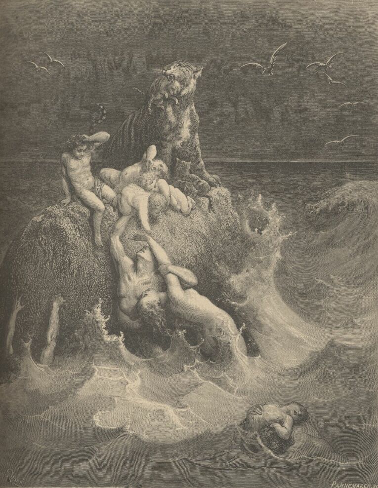 And the flood was forty days upon the earth; and the waters increased, and bare up the ark, and it was lift up above the earth. And the waters prevailed, and were increased, greatly upon the earth; and the ark went upon the face of the waters. And the waters prevailed exceedingly upon the earth; and all the high hills, that were under the whole heaven, were covered. Fifteen cubits upward did the waters prevail; and the mountains were covered. And all flesh died that moved upon the earth, both of fowl, and of cattle, and of beast, and of every creeping thing that creepeth upon the earth, and every man; all in whose nostrils was the breath of life, of all that was in the dry land, died. And every living substance was destroyed which was upon the face of the ground, both man and cattle, and the creeping things, and the fowl of the heaven; and they were destroyed from the earth; and Noah only remained alive, and they that were with him in the ark.