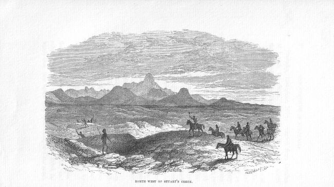 On the 14th of May, 1858, Mr. Stuart started from Oratunga (the head station of Mr. John Chambers), accompanied by Mr. Barker, with six horses, and all that was requisite (with one important exception, as will be seen hereafter), for an excursion to the north-west of Swinden's Country. They arrived at Aroona the same evening. On the following day (the 15th) they made Morleeanna Creek, and reached Ootaina on the 16th, about 7 p.m. Here they remained for a couple of days, as sufficient rain had not fallen to enable them to proceed. On the afternoon of the 19th they arrived at Mr. Sleep's, who informed them that Mr. M. Campbell had returned from the West, being hard pushed for water; very little rain having fallen to the west. The next day (20th) Mr. Stuart arrived at Mr. Louden's, but, in consequence of some difficulties about the horses, he returned to Ootaina. Various preparations, combined with want of rain, compelled him to delay his start until the 10th of June. Here the journal commences:—