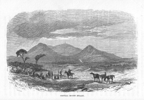 Mr. Stuart now turned his attention to crossing the interior, and, with the assistance of his friends Messrs. Chambers and Finke, he was enabled to make two preparatory expeditions in the vicinity of Lake Torrens—from April 2nd to July 3rd, 1859, and from November 4th, 1859, to January 21st, 1860. The fourth expedition started from Chambers Creek (discovered by Mr. Stuart in 1858, and since treated as his head-quarters for exploring purposes), on March 2nd, 1860, and consisted of Mr. Stuart and two men, with thirteen horses. Proceeding steadily northwards, until the country which his previous explorations had rendered familiar was left far behind, on April 23rd the great explorer calmly records in his Journal the following important announcement: "To-day I find from my observations of the sun that I am now camped in the CENTRE OF AUSTRALIA." One of the greatest problems of Australian discovery was solved! The Centre of the continent was reached, and, instead of being an inhospitable desert or an inland sea, it was a splendid grass country through which ran numerous watercourses.