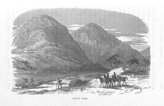 Friday, 25th June, Yarraout Gum Creek. Started at 9.40 from the point where we first struck the creek last night, bearing 20 degrees for two miles, thence 61 degrees for one mile to a high sand hill, thence 39 degrees for one mile to a stony rise. My doubt of the black fellow's knowledge of the country is now confirmed; he seems to be quite lost, and knows nothing of the country, except what he has heard other blacks relate; he is quite bewildered and points all round when I ask him the direction of Wingillpin. I have determined to push into the westward, keeping a little north of west. Bearing 292 degrees for five miles, sand hills; thence 327 degrees to a table-hill nine miles. Camped without water. Our route to-day has been through sand hills, with a few miles of stones and dry reedy swamp, all well grassed, but no water. We came across some natives, who kept a long distance off. I sent our black up to them, to ask in which direction Wingillpin lay. They pointed to the course I was then steering, and said, "Five sleeps." They would not come near to us. About three-quarters of an hour afterwards I came suddenly upon another native, who was hunting in the sand hills. My attention being engaged in keeping the bearing, I did not observe him until he moved, but I pulled up at once, lest he should run away, and called to him. What he imagined I was I do not know; but when he turned round and saw me, I never beheld a finer picture of astonishment and fear. He was a fine muscular fellow, about six feet in height, and stood as if riveted to the spot, with his mouth wide open, and his eyes staring. I sent our black forward to speak with him, but omitted to tell him to dismount. The terrified native remained motionless, allowing our black to ride within a few yards of him, when, in an instant, he threw down his waddies, and jumped up into a mulga bush as high as he could, one foot being about three feet from the ground, and the other about two feet higher, and kept waving us off with his hand as we advanced. I expected every moment to see the bush break with his weight. When close under the bush, I told our black to inquire if he were a Wingillpin native. He was so frightened he could not utter a word, and trembled from head to foot. We then asked him where Wingillpin was. He mustered courage to let go one hand, and emphatically snapping his fingers in a north-west direction, again waved us off. I take this emphatic snapping of his fingers to mean a long distance. Probably this Wingillpin may be Cooper's Creek. We then left him, and proceeded on our way through the sand hills. About an hour before sunset, we came in full sight of a number of tent and table-topped hills to the north-west, the stony table land being to the south of us, and the dip of the country still towards Lake Torrens. I shall keep a little more to the west to-morrow if possible, to get the fall of the country the other way. The horses' shoes have been worn quite thin by the stones, and will not last above a day or two. Nay, some of the poor animals are already shoeless. It is most unfortunate that we did not bring another set with us. Distance to-day, twenty-four miles.