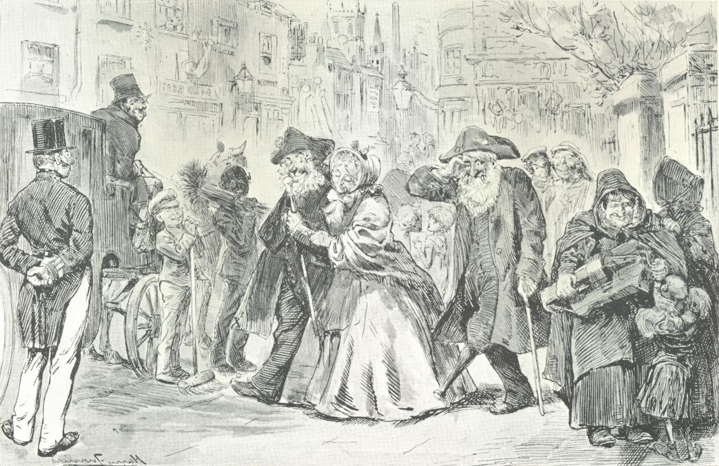 Walking faster under my share of this public injury, I overturned a wretched little creature, who, clutching at the rags of a pair of trousers with one of its claws, and at its ragged hair with the other, pattered with bare feet over the muddy stones. I stopped to raise and succour this poor weeping wretch, and fifty like it, but of both sexes, were about me in a moment, begging, tumbling, fighting, clamouring, yelling, shivering in their nakedness and hunger. The piece of money I had put into the claw of the child I had over-turned was clawed out of it, and was again clawed out of that wolfish gripe, and again out of that, and soon I had no notion in what part of the obscene scuffle in the mud, of rags and legs and arms and dirt, the money might be. In raising the child, I had drawn it aside out of the main thoroughfare, and this took place among some wooden hoardings and barriers and ruins of demolished buildings, hard by Temple Bar.