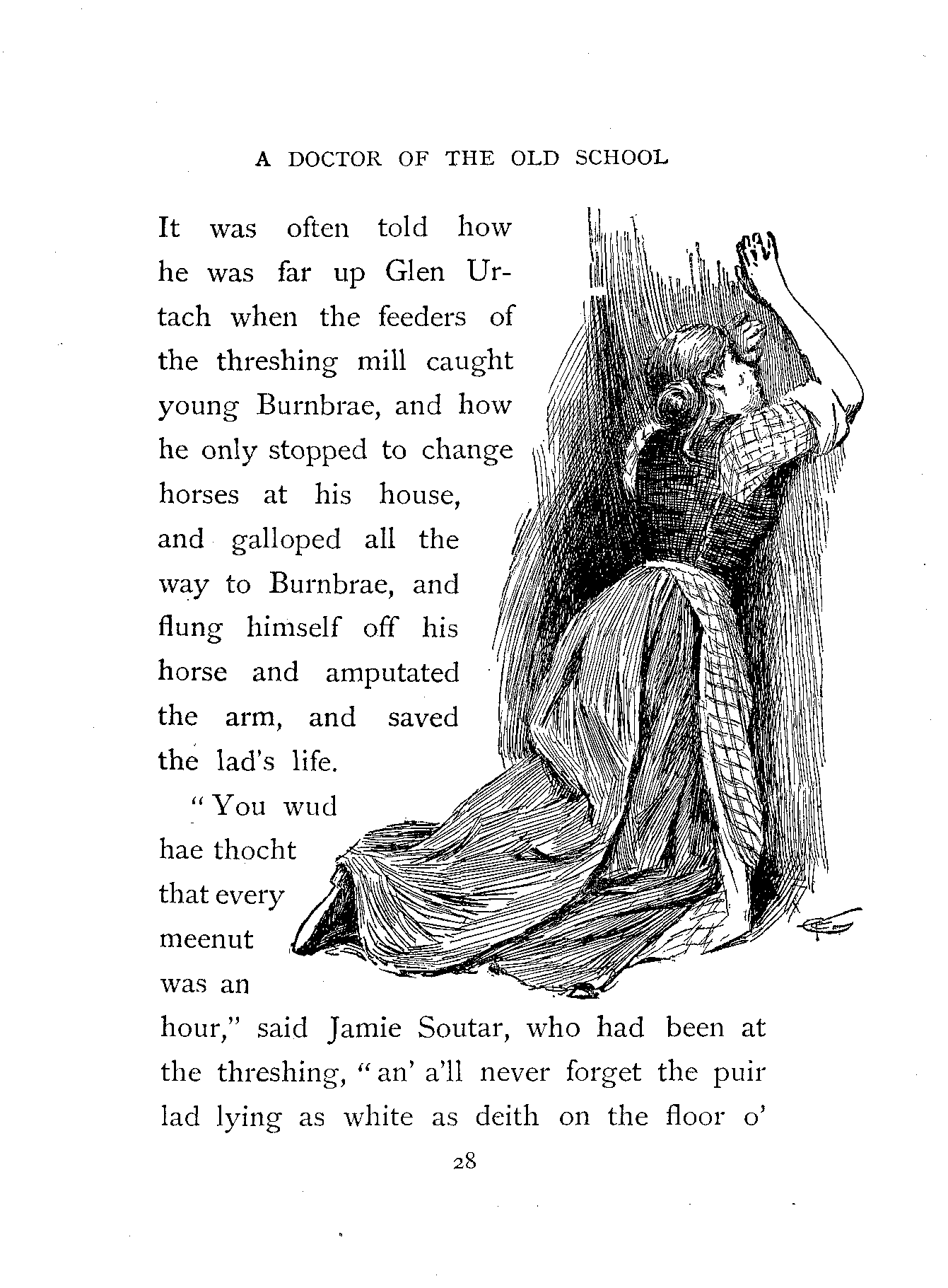 "Whar is he?' wes a' that passed his lips, an' in five meenuts he hed him on the feedin' board, and wes at his wark—sic wark, neeburs—but he did it weel. An' ae thing a' thocht rael thochtfu' o' him: he first sent aff the laddie's mither tae get a bed ready.