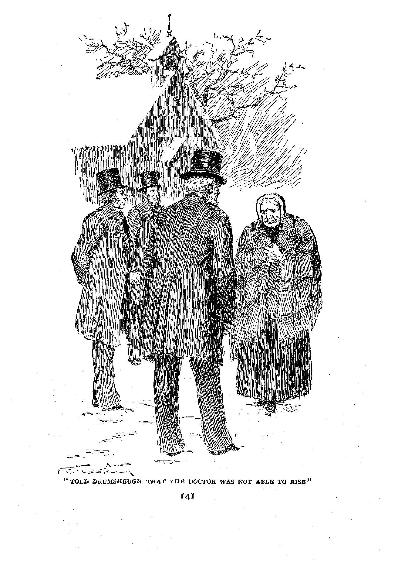 It was a bitter December Sabbath, and the fathers were settling the affairs of the parish ankle deep in snow, when MacLure's old housekeeper told Drumsheugh that the doctor was not able to rise, and wished to see him in the afternoon. "Ay, ay," said Hillocks, shaking his head, and that day Drumsheugh omitted four pews with the ladle, while Jamie was so vicious on the way home that none could endure him.