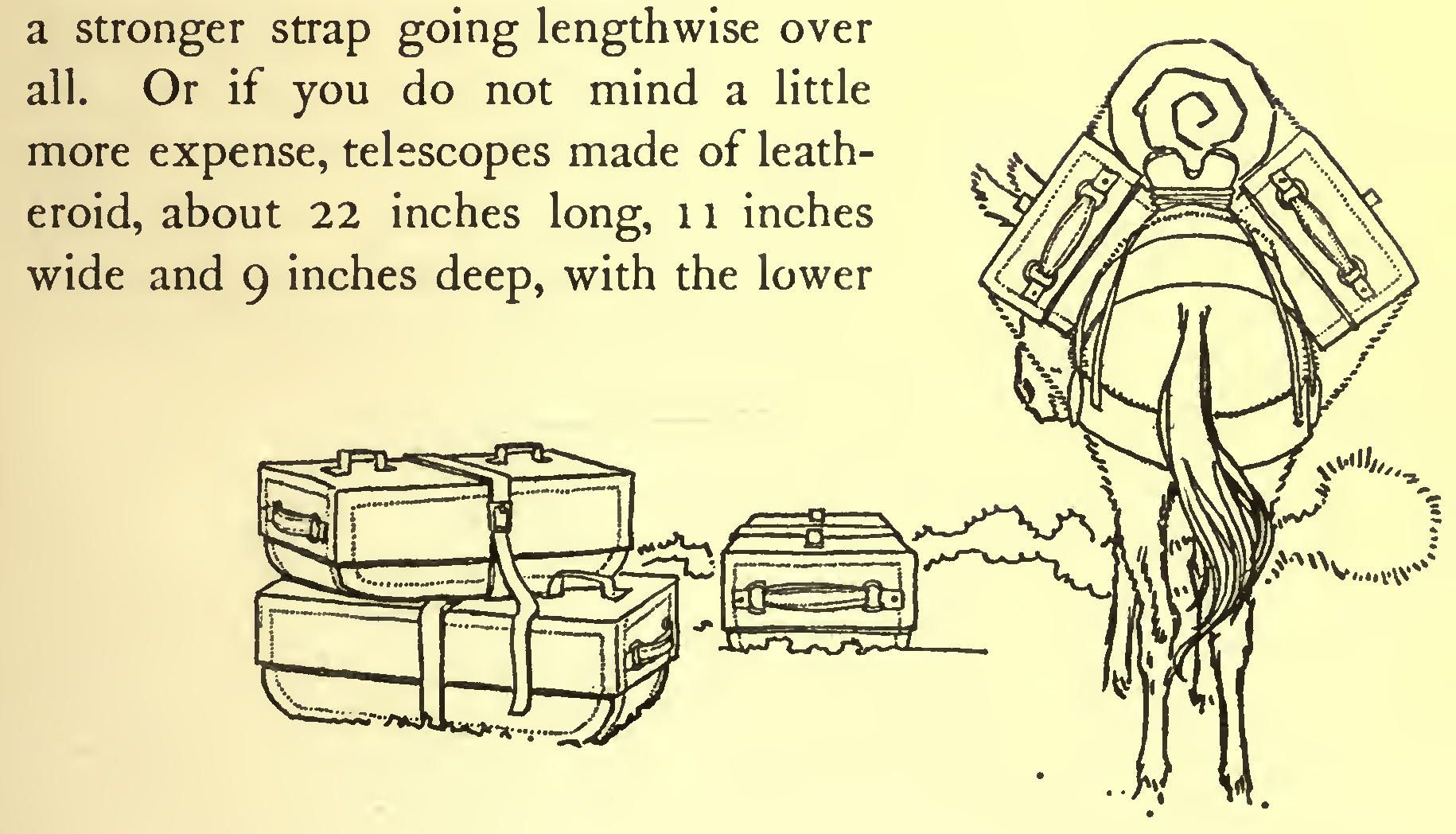 Of course one must have clothes and personal comforts, so, while we are still in the city humor, let us order a habit suitable for riding astride. Whipcord, or a closely woven homespun, in some shade of grayish brown that harmonizes with the landscape, is best. Corduroy is pretty, if you like it, but rather clumsy. Denham will do, but it wrinkles and becomes untidy. Indeed it has been my experience that it is economy to buy the best quality of cloth you can afford, for then the garment always keeps its shape, even after hard wear, and can be cleaned and made ready for another year, and another, and another. You will need it, never fear. Once you have opened your ears, "the Red Gods" will not cease to "call for you."