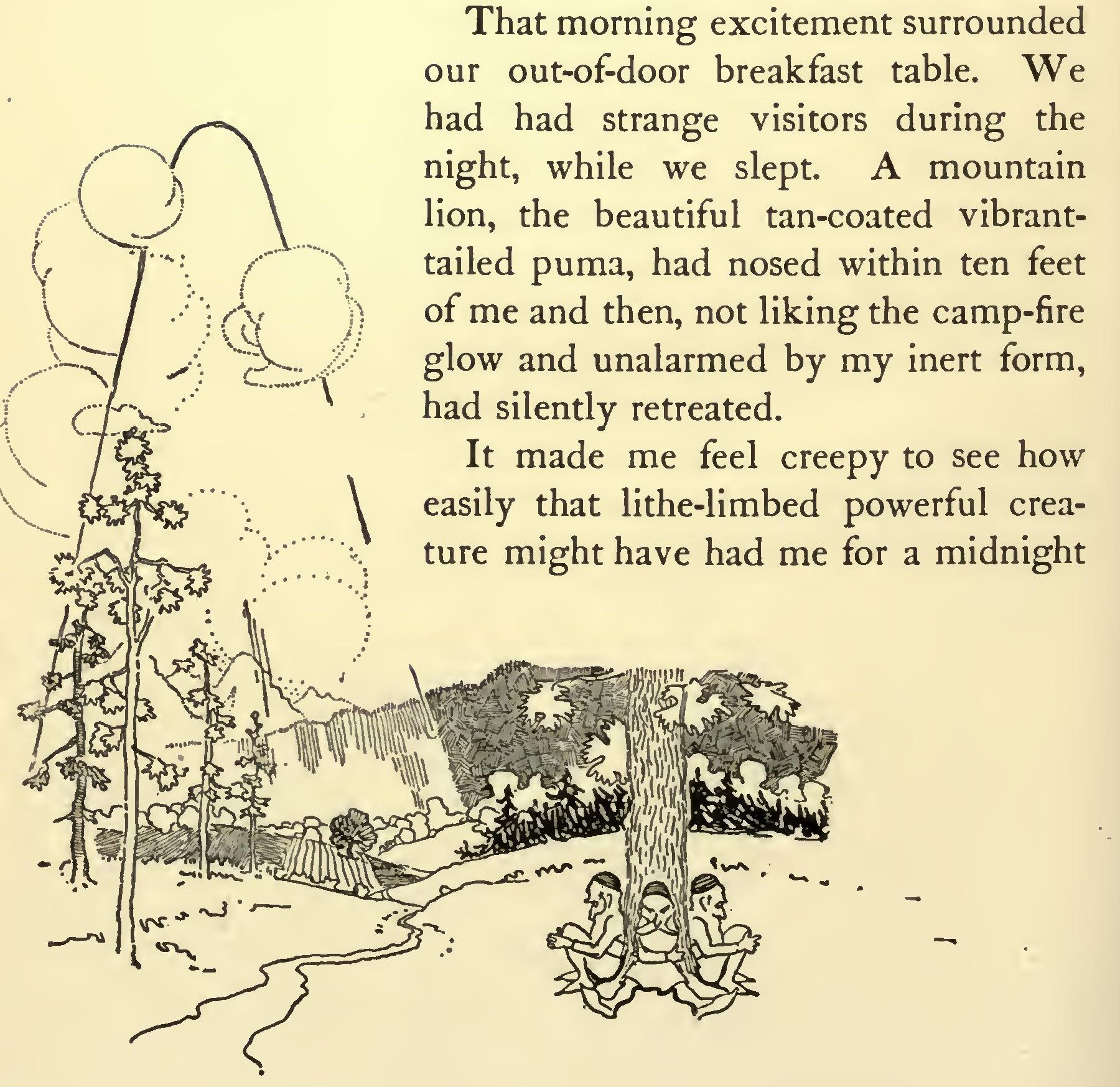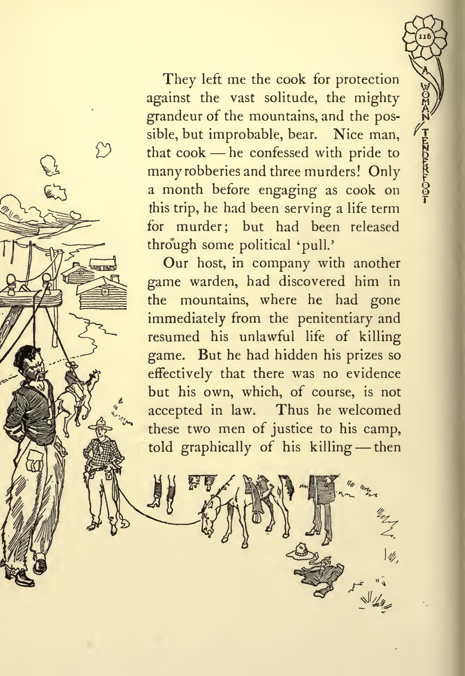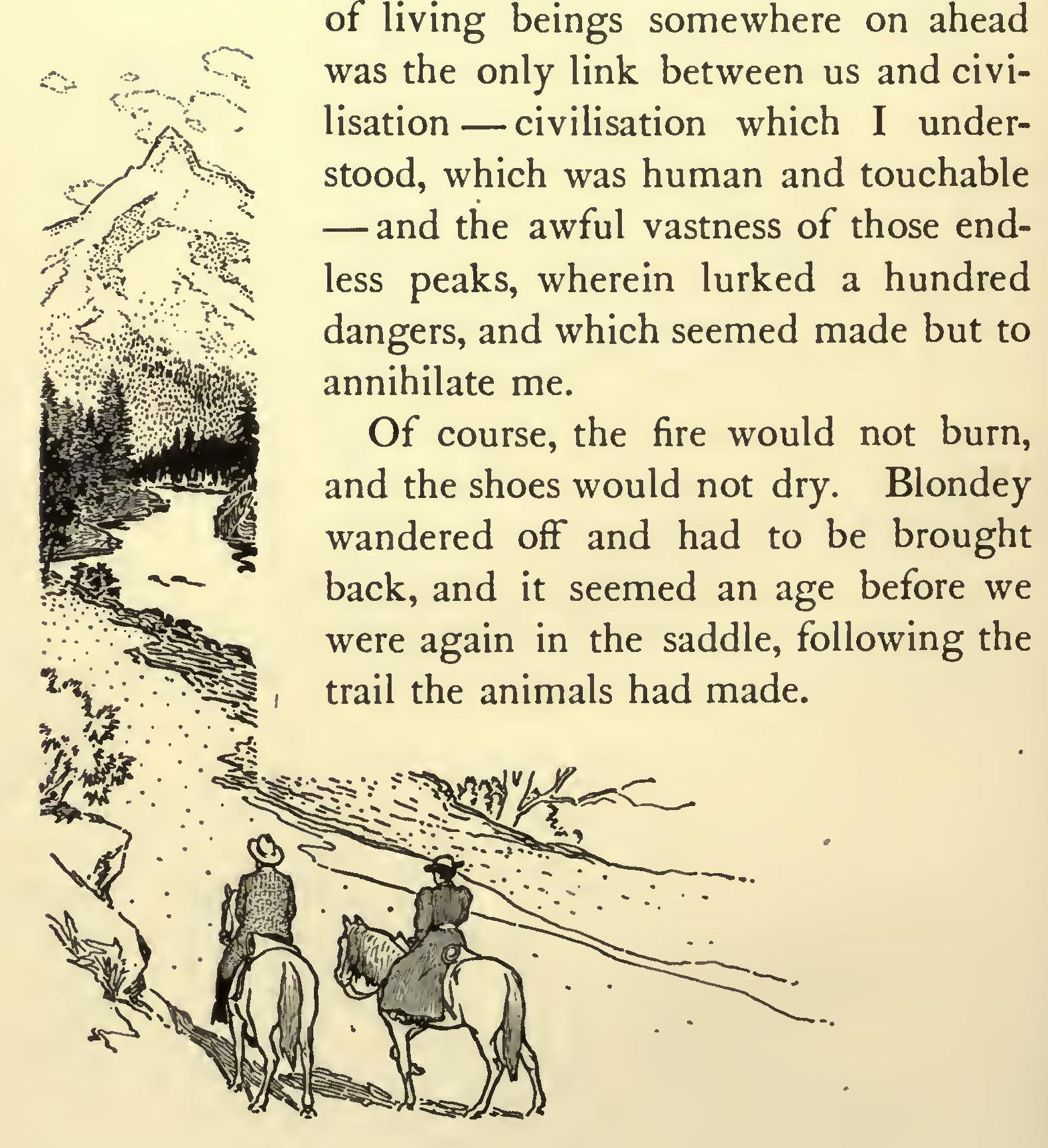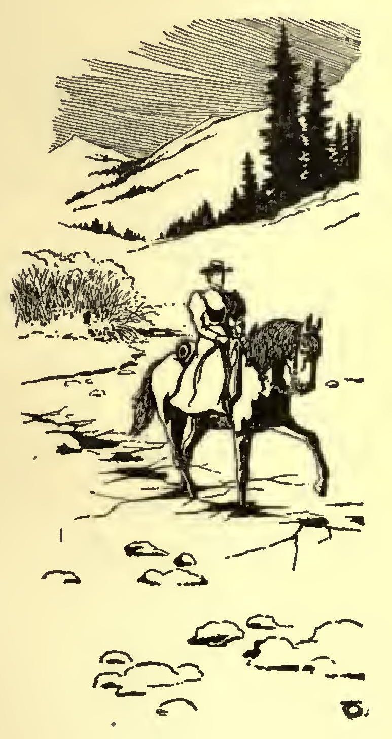 Theoretically, I have always agreed with the Quaker wife who reformed her husband—"Whither thou goest, I go also, Dicky dear." What thou doest, I do also, Dicky dear. So when, the year after our marriage, Nimrod announced that the mountain madness was again working in his blood, and that he must go West and take up the trail for his holiday, I tucked my summer-watering-place-and-Europe-flying-trip mind away (not without regret, I confess) and cautiously tried to acquire a new vocabulary and some new ideas.