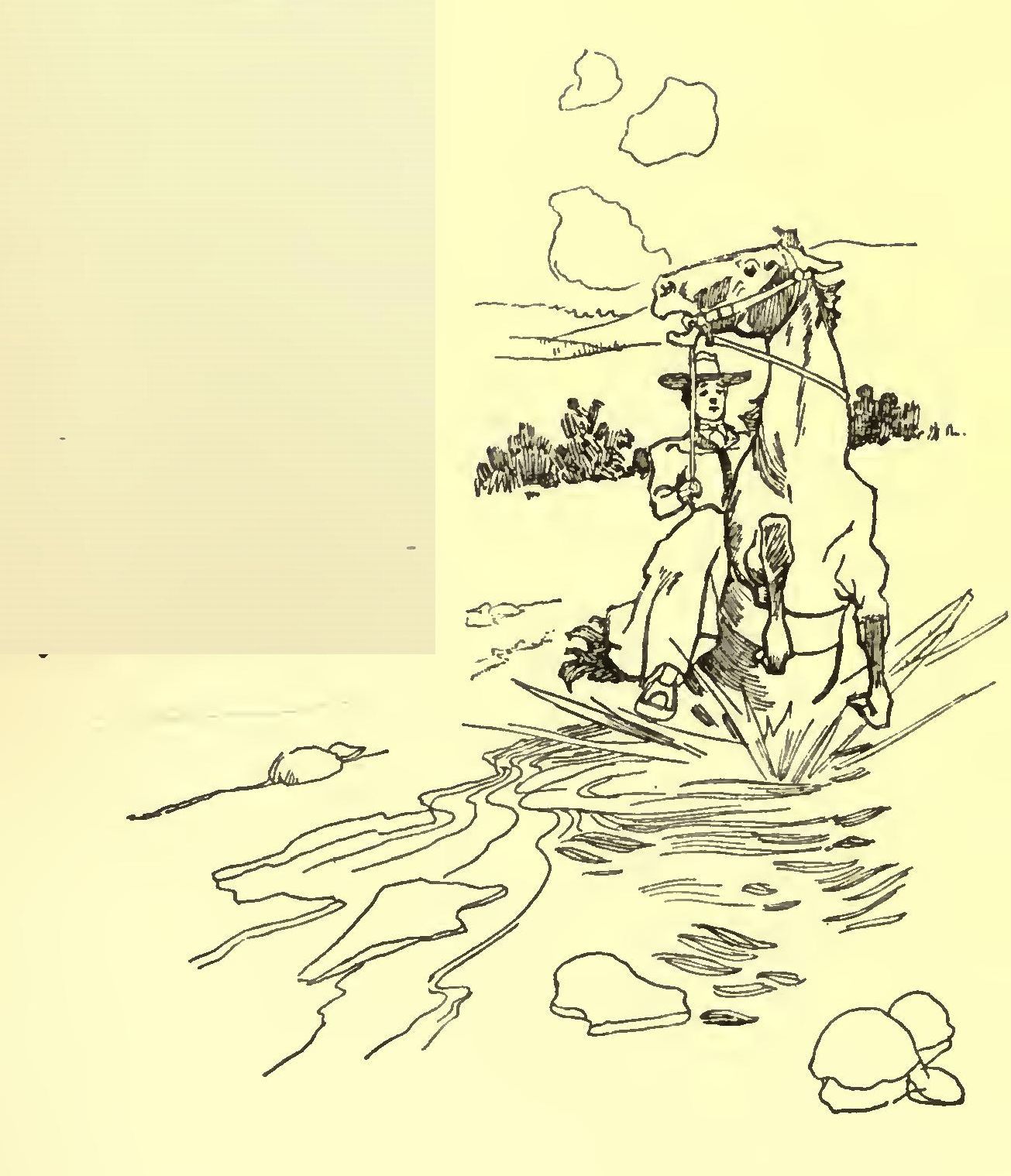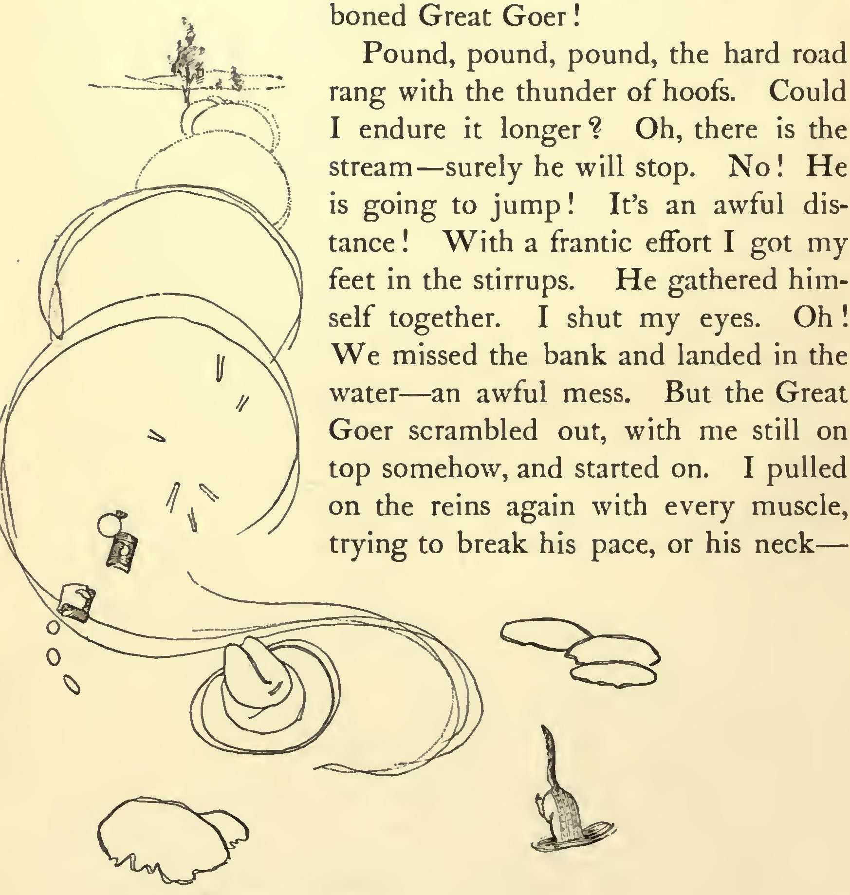 I had a man's saddle, with a narrow tree and high pommel and cantle, such as is used out West, and as I had not ridden a horse since the hazy days of my infancy, I got on the huge creature's back with everything to learn. Fear enveloped me as in a cloud during my first ride, and the possibilities of the little cow pony they put me on seemed more awe-inspiring than those of a locomotive. But I have been reading Professor William James and acquired from him the idea (I hope I do not malign him) that the accomplishment of a thing depends largely upon one's mental attitude, and this was mine all nicely taken—in New York:—