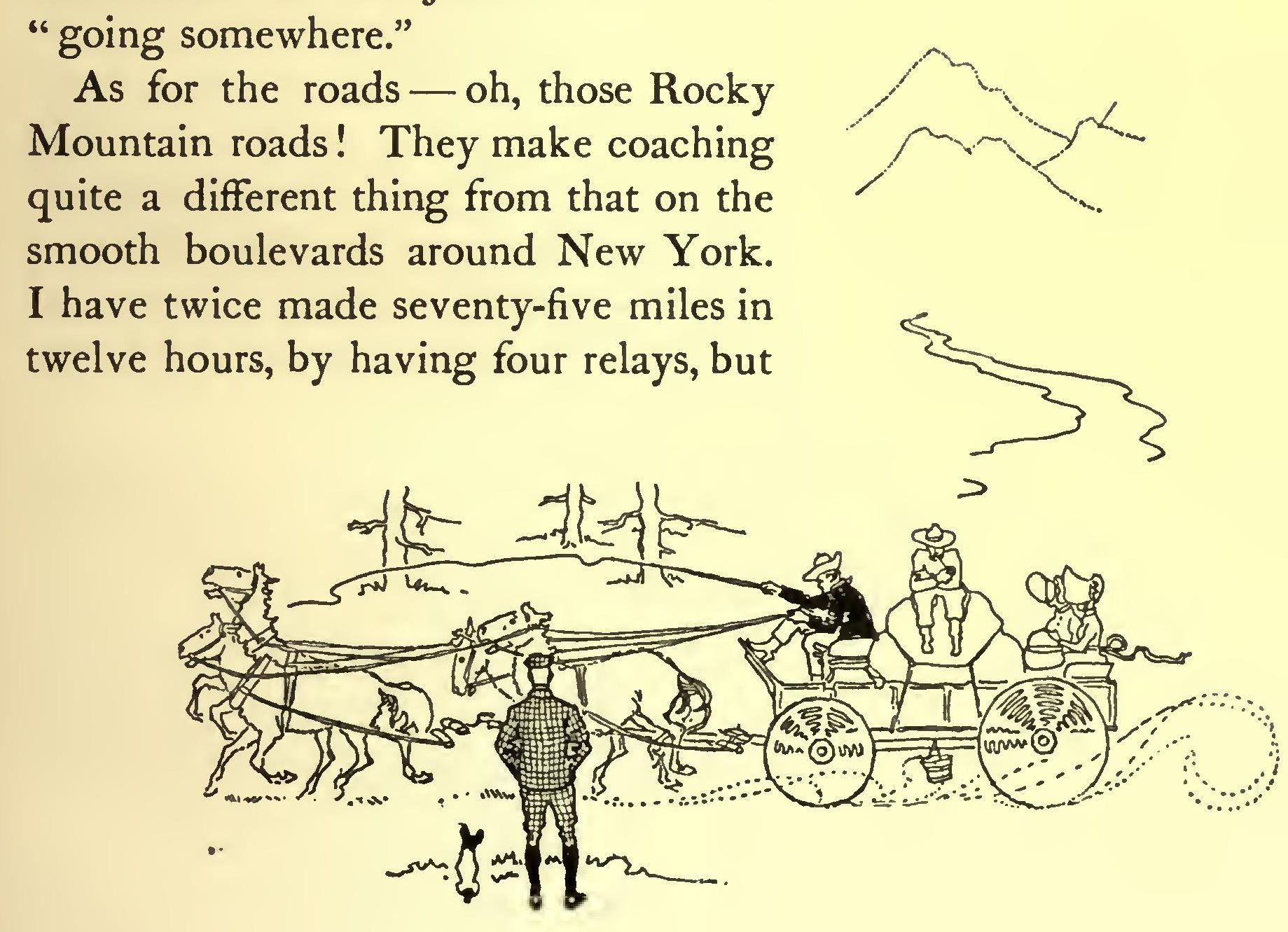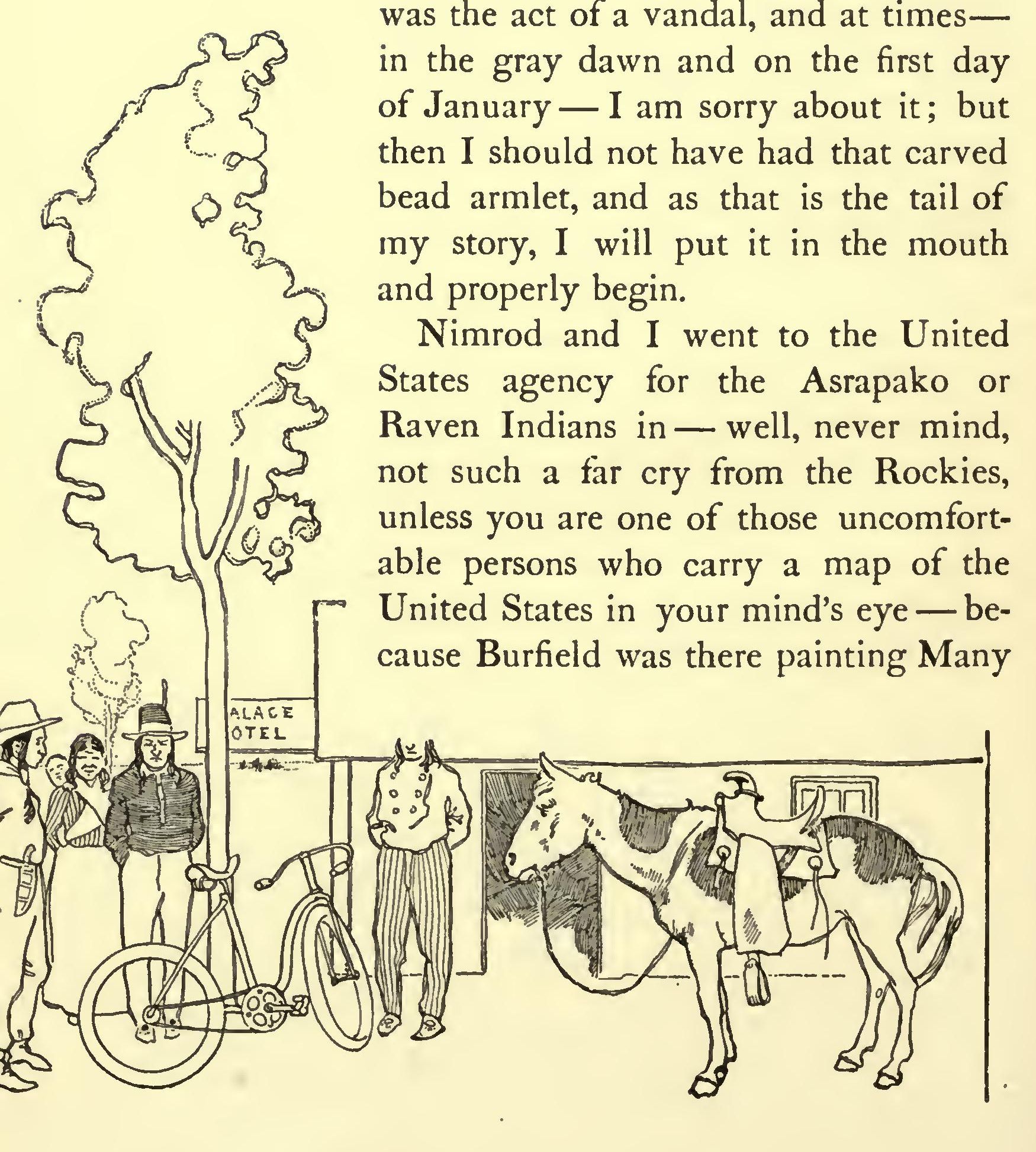 Is one never to forget that it is not proper to wear gold beads with crape? Understand, I am not to be set down as having any charity for the ignoramus who would wear that combination, but I wish to record the fact that there are times, under the spell of the West, when I simply do not care whether there are such things as gold beads and crape; when the whole business of city life, the music, arts, drama, the pleasant friends, equally with the platitudes of things and people you care not about—civilization, in a word—when all these fade away from my thoughts as far as geographically they are, and in their place comes the joy of being at least a healthy, if not an intelligent, animal. It is a pleasure to eat when the time comes around, a good old-fashioned pleasure, and you need no dainty serving to tempt you. It is another pleasure to use your muscles, to buffet with the elements, to endure long hours of riding, to run where walking would do, to jump an obstacle instead of going around it, to return, physically at least, to your pinafore days when you played with your brother Willie. Red blood means a rose-colored world. Did you feel like that last summer at Newport or Narragansett?