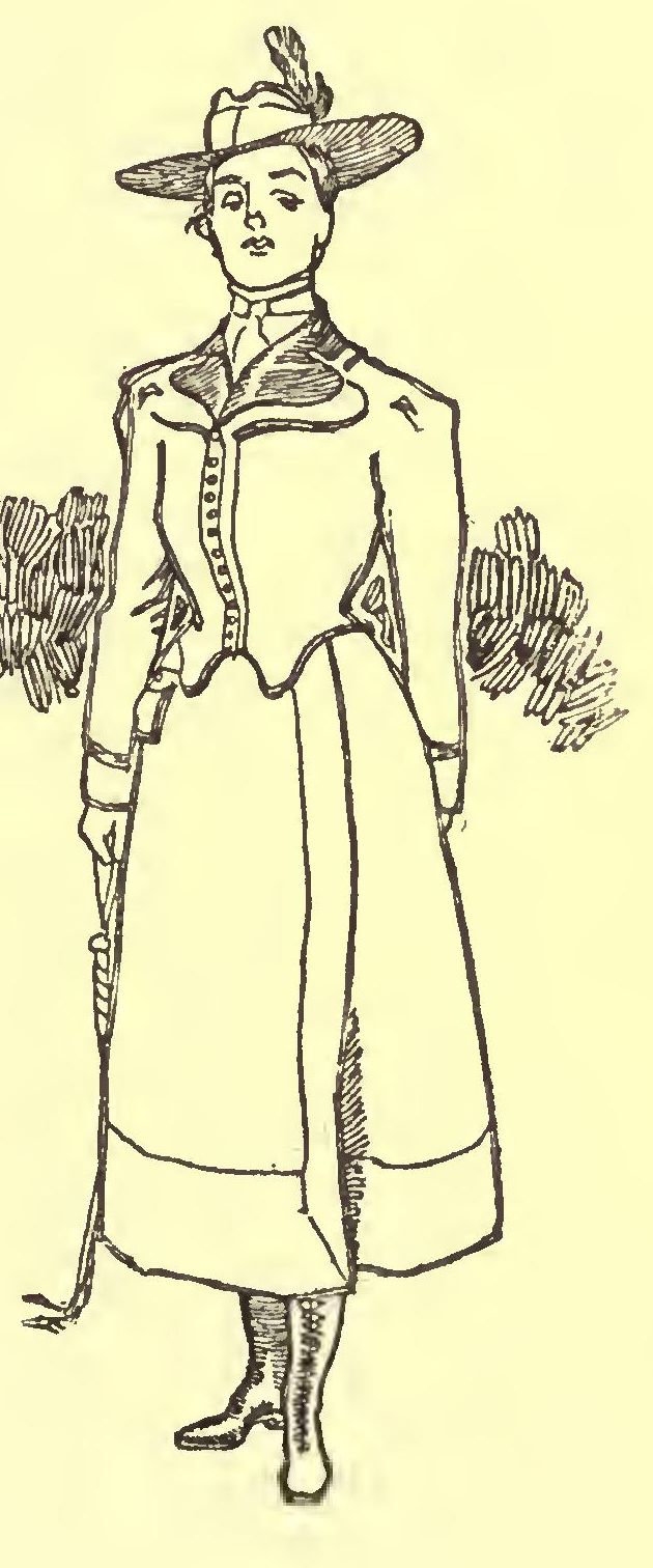 Any style of jacket is of course suitable. One that looks well on the horse is tight fitting, with postilion back, short on hips, sharp pointed in front, with single-breasted vest of reddish leather (the habit material of brown whipcord), fastened by brass buttons, leather collar and revers, and a narrow leather band on the close-fitting sleeves. A touch of leather on the skirt in the form of a patch pocket is harmonious, but any extensive leather trimming on the skirt makes it unnecessarily heavy.