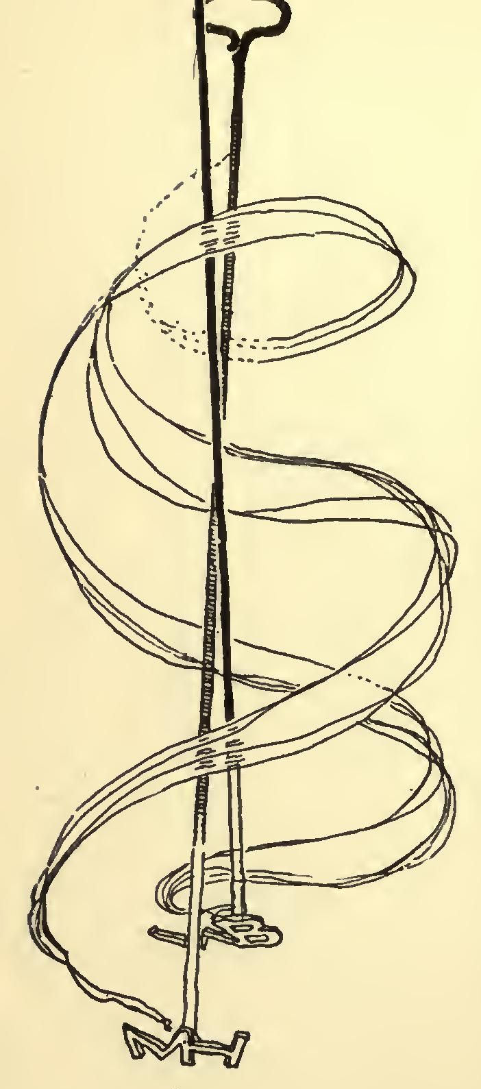 One can do a wonderful amount of smartening up with tulle, hat pins, belts, and fancy neck ribbons, all of which comparatively take up no room and add no weight, always the first consideration. Be sure you supply yourself with a reserve of hat pins. Two devices by which they may be made to stay in the hat are here shown. The spiral can be given to any hat pin. The chain and small brooch should be used if the hat pin is of much value.
