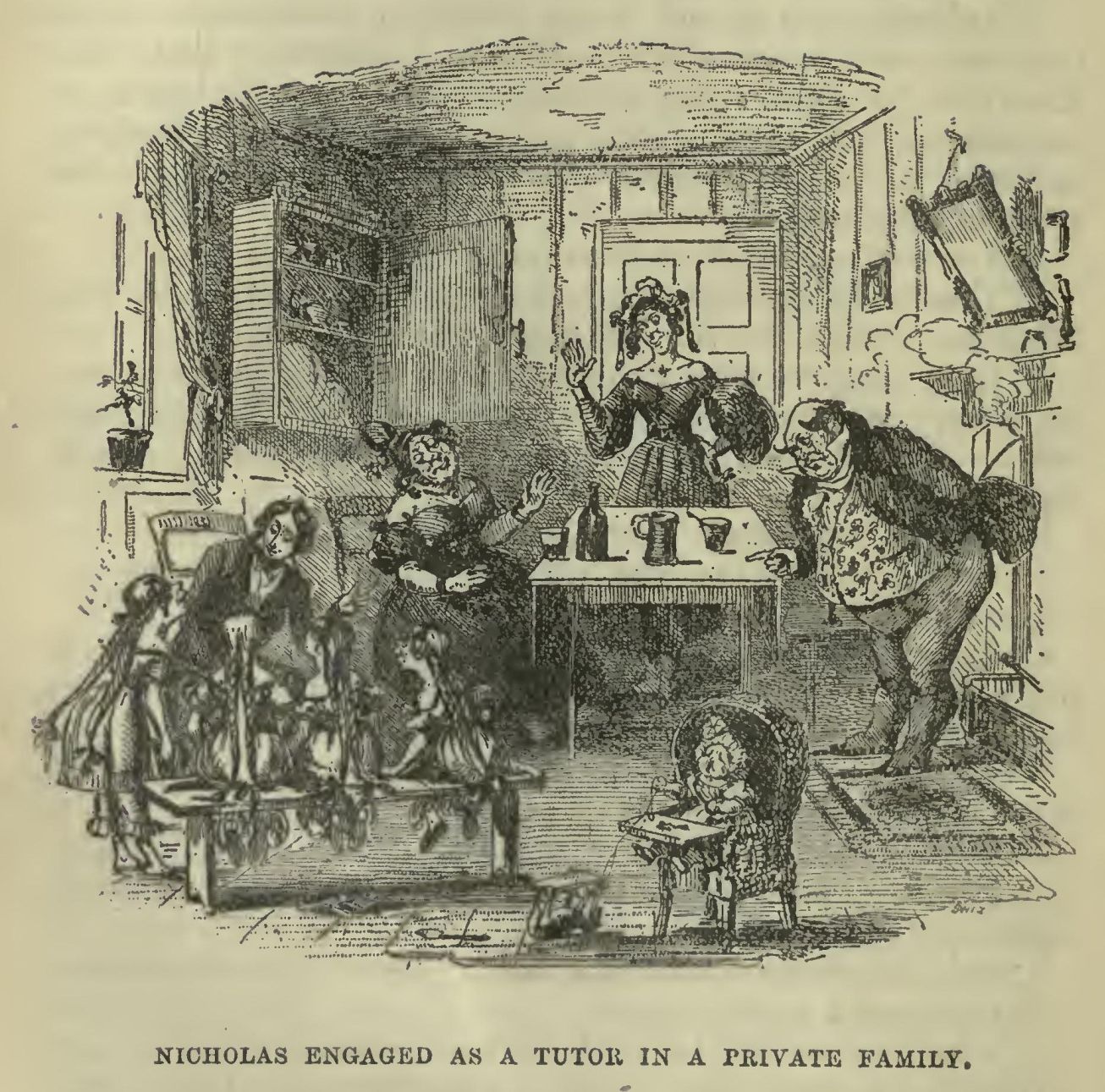 As for Nicholas, he lived a single man on the patrimonial estate until he grew tired of living alone, and then he took to wife the daughter of a neighbouring gentleman with a dower of one thousand pounds. This good lady bore him two children, a son and a daughter, and when the son was about nineteen, and the daughter fourteen, as near as we can guess—impartial records of young ladies’ ages being, before the passing of the new act, nowhere preserved in the registries of this country—Mr. Nickleby looked about him for the means of repairing his capital, now sadly reduced by this increase in his family, and the expenses of their education.