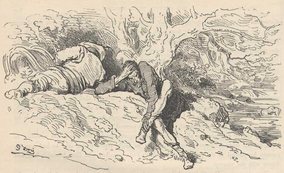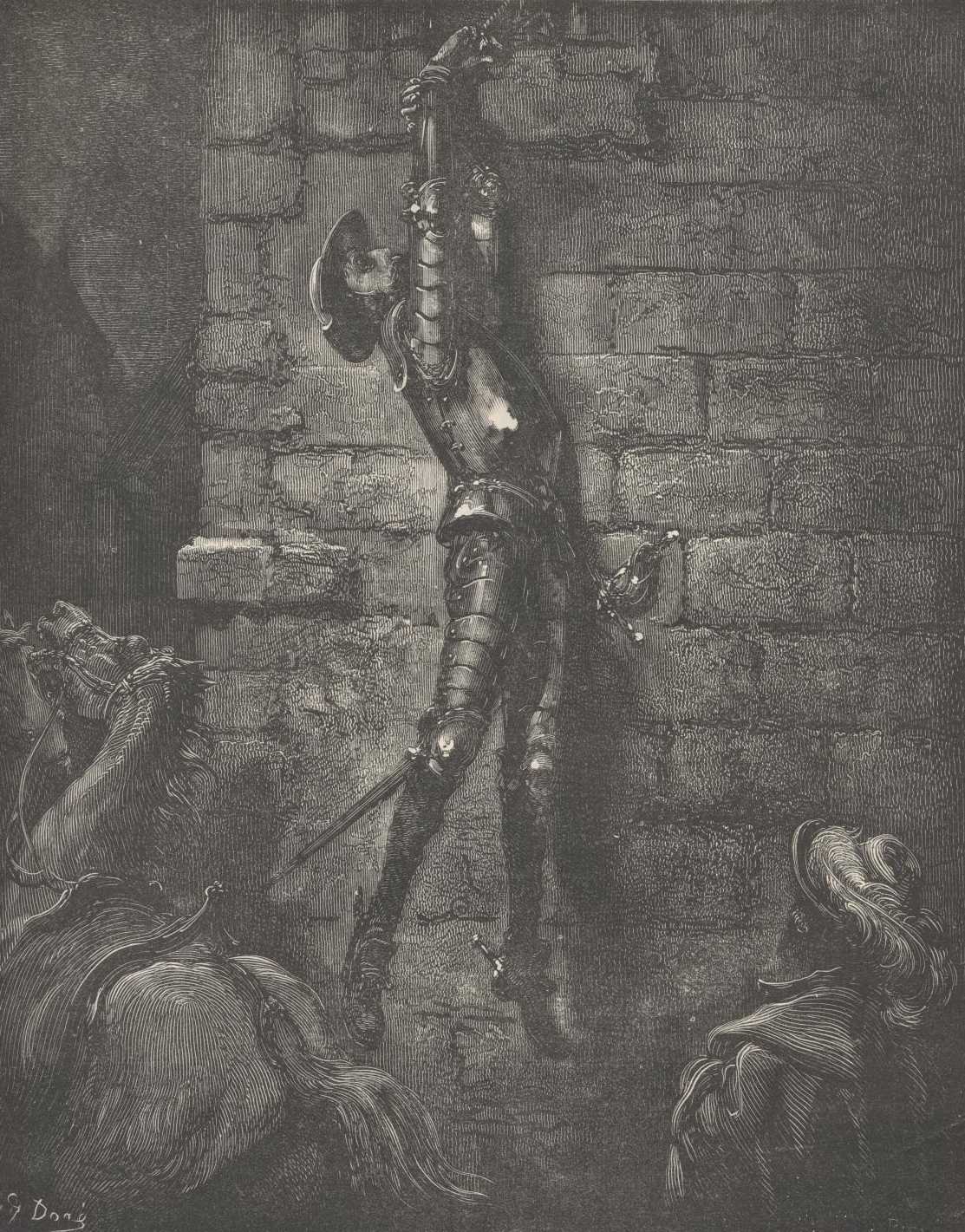 The book cover and spine above and the images which follow were not part of the original Ormsby translation—they are taken from the 1880 edition of J. W. Clark, illustrated by Gustave Doré. Clark in his edition states that, “The English text of ‘Don Quixote’ adopted in this edition is that of Jarvis, with occasional corrections from Motteaux.” See in the introduction below John Ormsby’s critique of both the Jarvis and Motteaux translations. It has been elected in the present Project Gutenberg edition to attach the famous engravings of Gustave Doré to the Ormsby translation instead of the Jarvis/Motteaux. The detail of many of the Doré engravings can be fully appreciated only by utilizing the “Full Size” button to expand them to their original dimensions. Ormsby in his Preface has criticized the fanciful nature of Doré’s illustrations; others feel these woodcuts and steel engravings well match Quixote’s dreams. D.W.