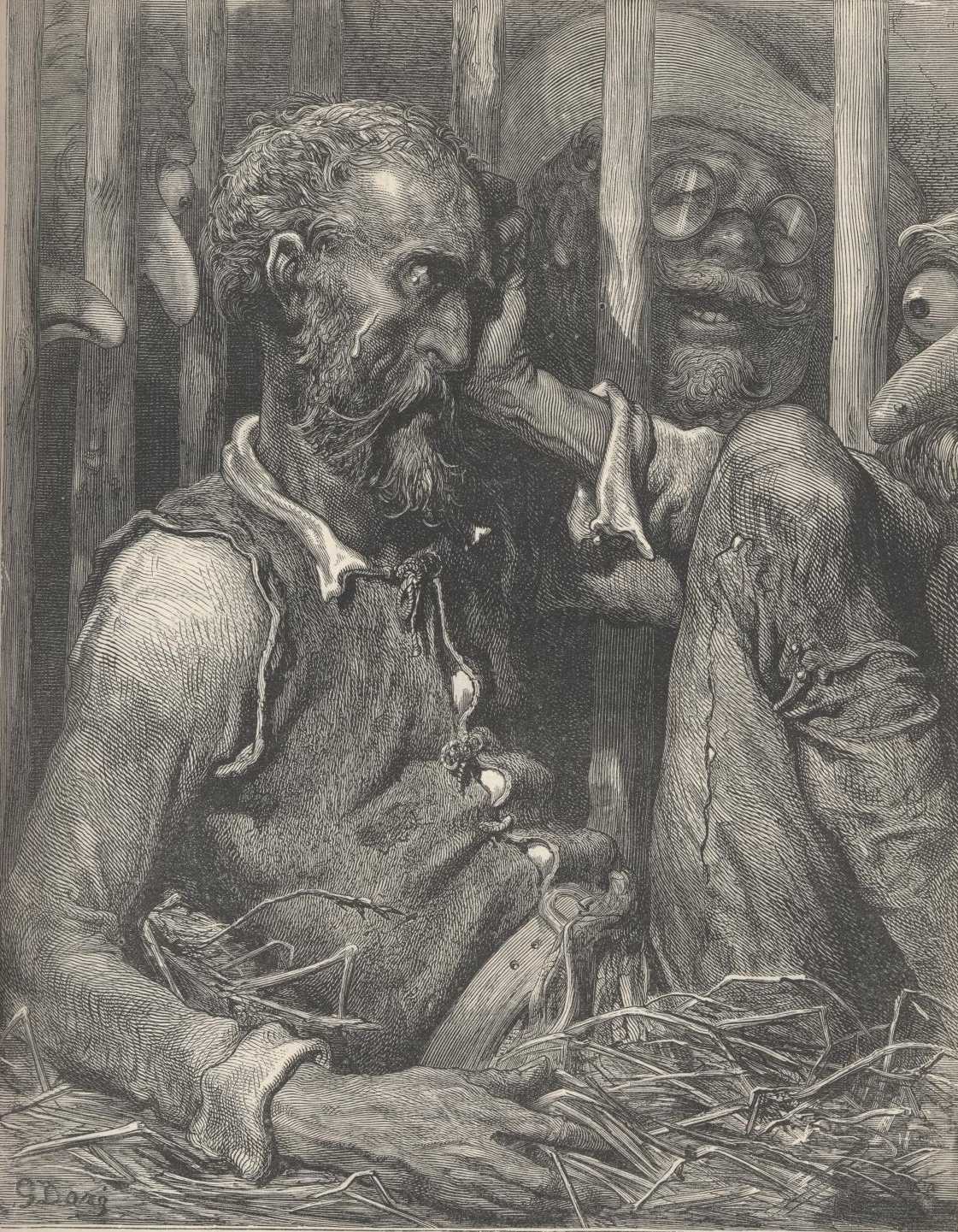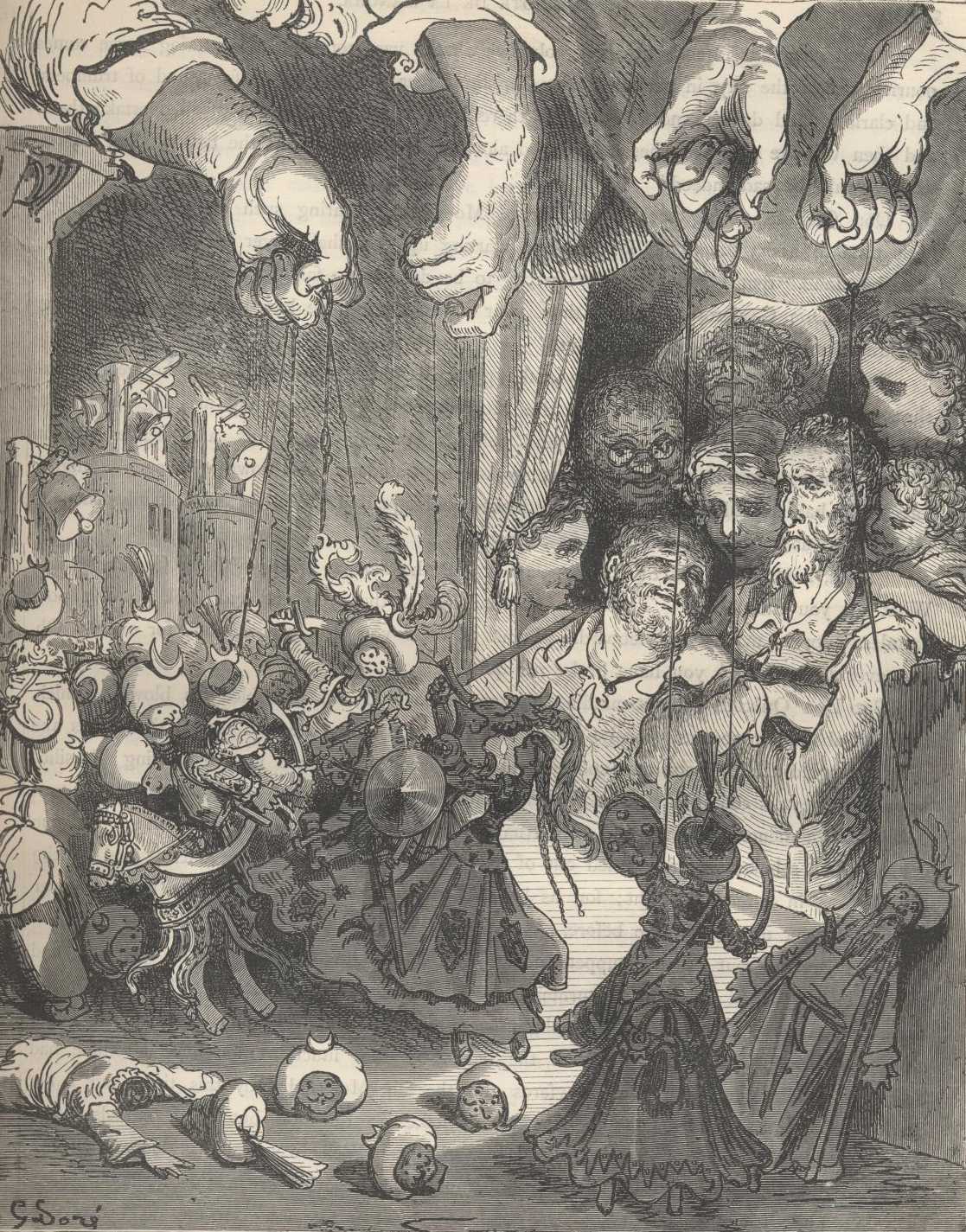 At the sound of his piteous cry and of the stroke of the cruel lash, Don Quixote ran to him at once, and seizing the twisted halter that served him for a courbash, said to him, “Heaven forbid, Sancho my friend, that to please me thou shouldst lose thy life, which is needed for the support of thy wife and children; let Dulcinea wait for a better opportunity, and I will content myself with a hope soon to be realised, and have patience until thou hast gained fresh strength so as to finish off this business to the satisfaction of everybody.”