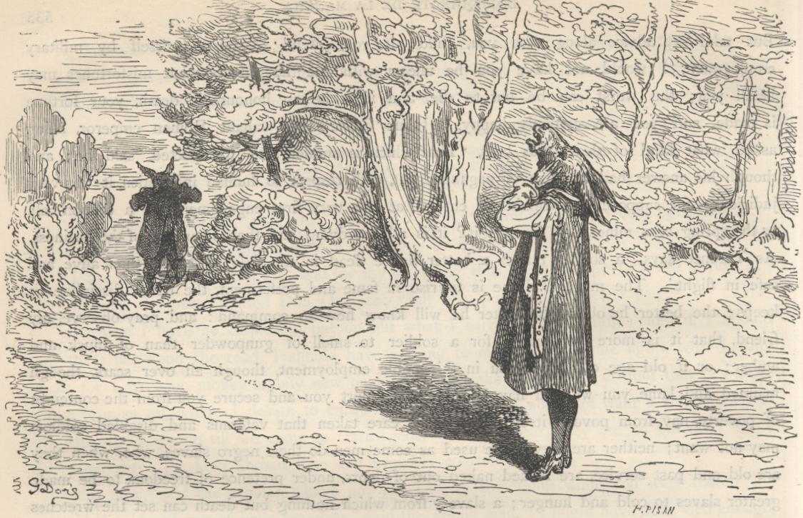 Sancho was about to answer, when his attention was diverted by seeing a hare come flying across the plain pursued by several greyhounds and sportsmen. In its terror it ran to take shelter and hide itself under Dapple. Sancho caught it alive and presented it to Don Quixote, who was saying, “Malum signum, malum signum! a hare flies, greyhounds chase it, Dulcinea appears not.”